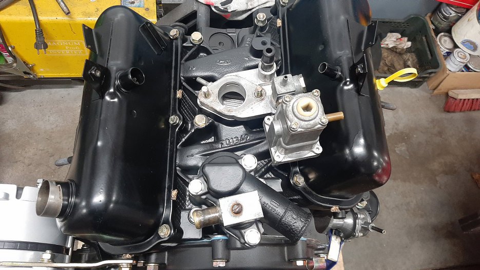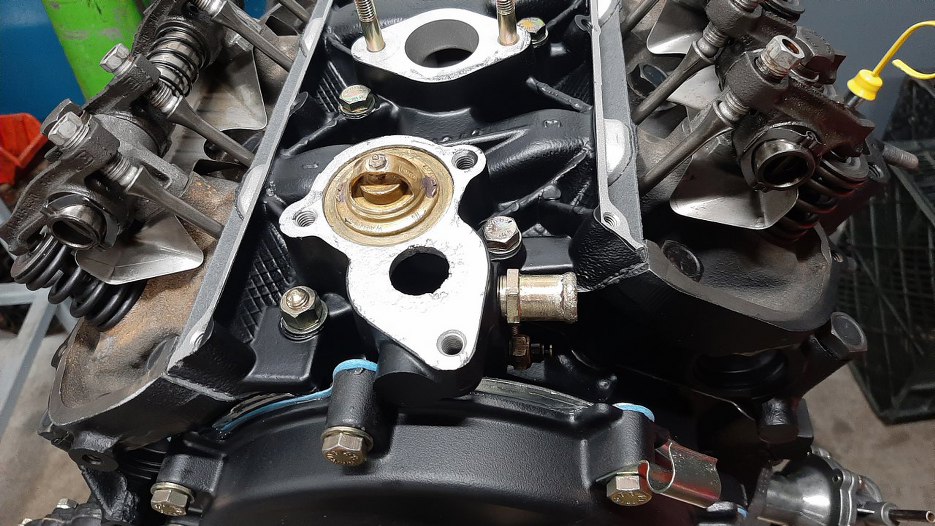 Wkręciłem króciec kolektora dolotowego (poniżej termostatu po prawej) i założyłem termostat.
