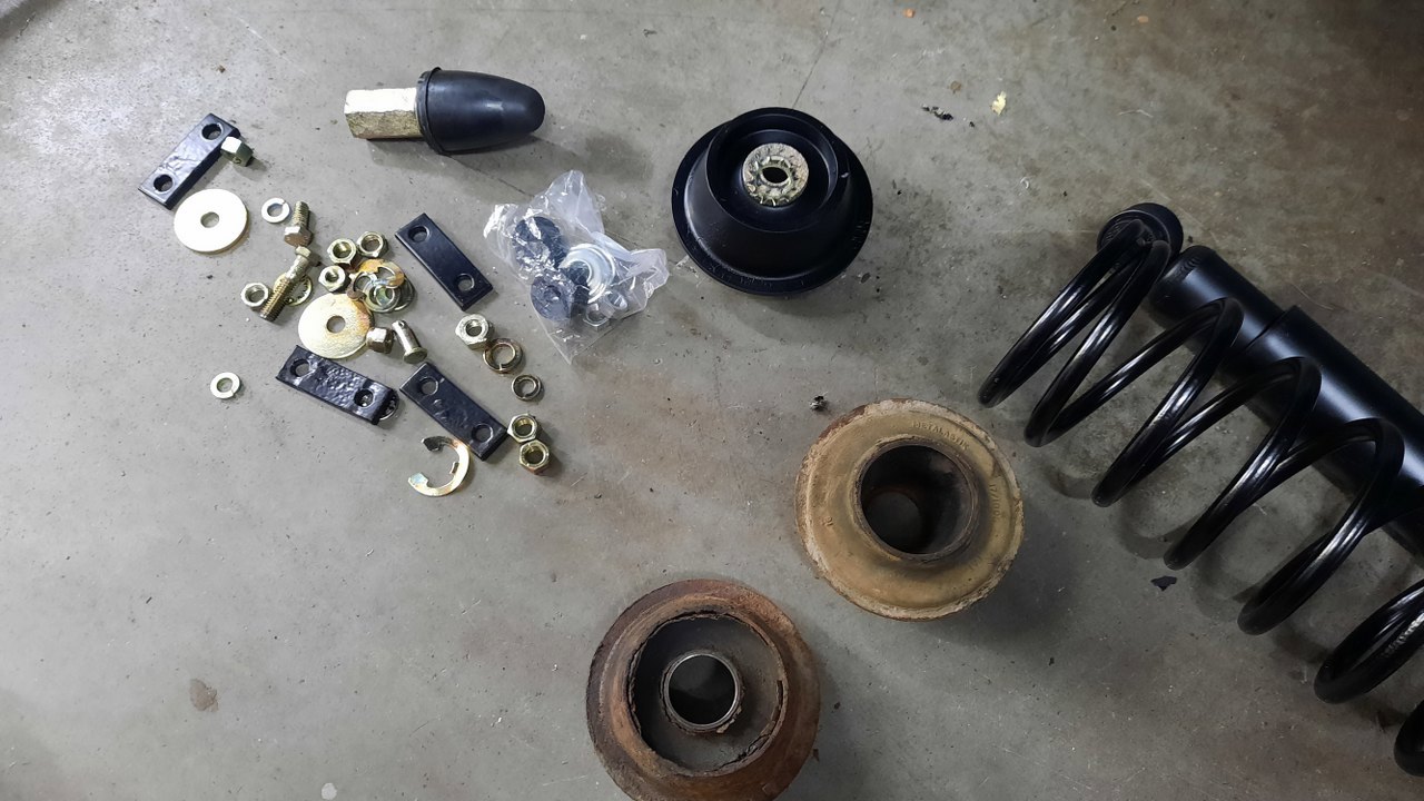 W międzyczasie prac blacharskich udało się kupić dwie nowe poduszki tylnych sprężyn. Cholernie niestety drogie, długi czas niedostępne, ale w końcu są. Stare nie nadają się do założenia.