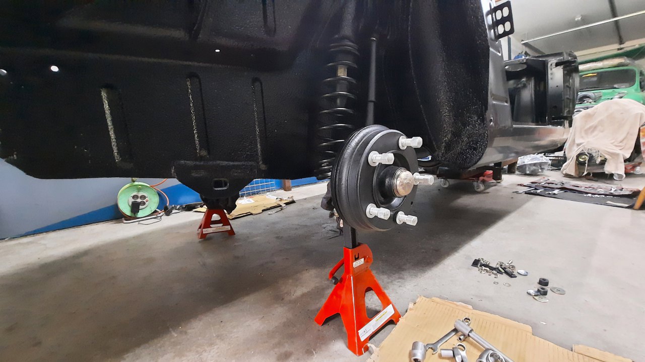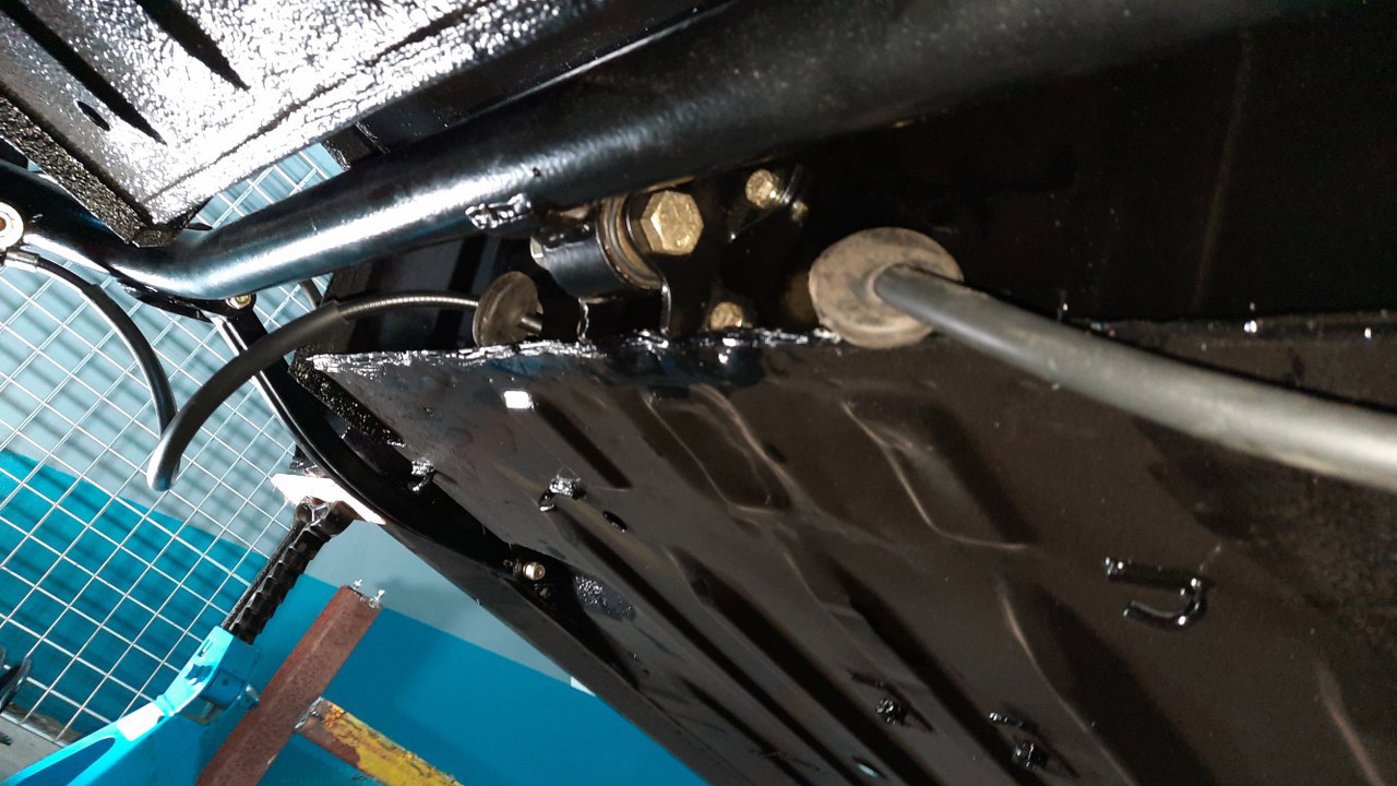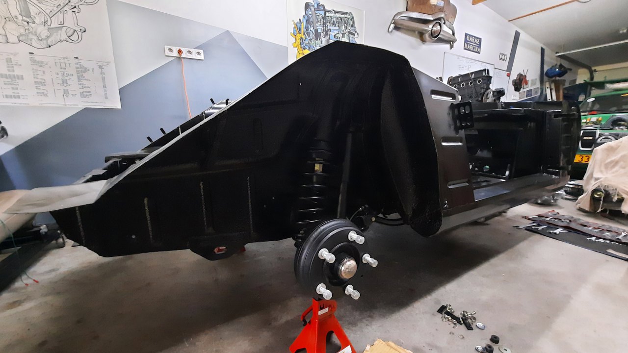 Przesunąłem zawieszenie pod samochód i przykręciłem wahacze do podłogi. To jest zdjęcie od dołu.
