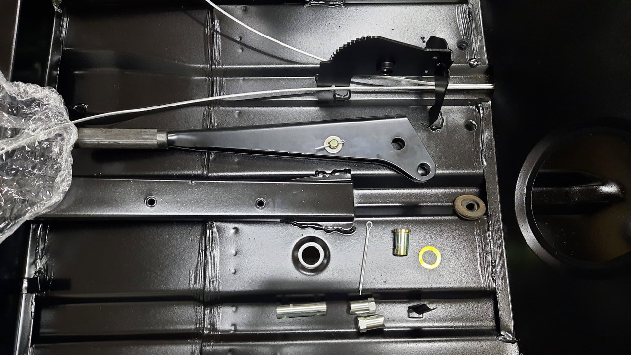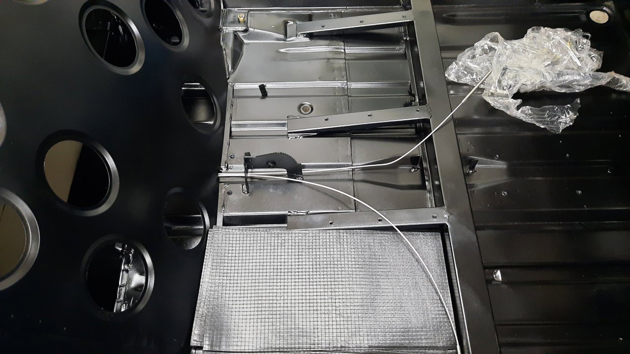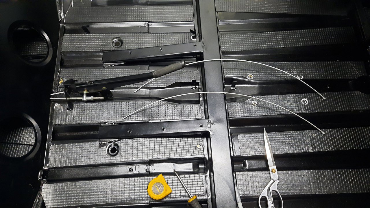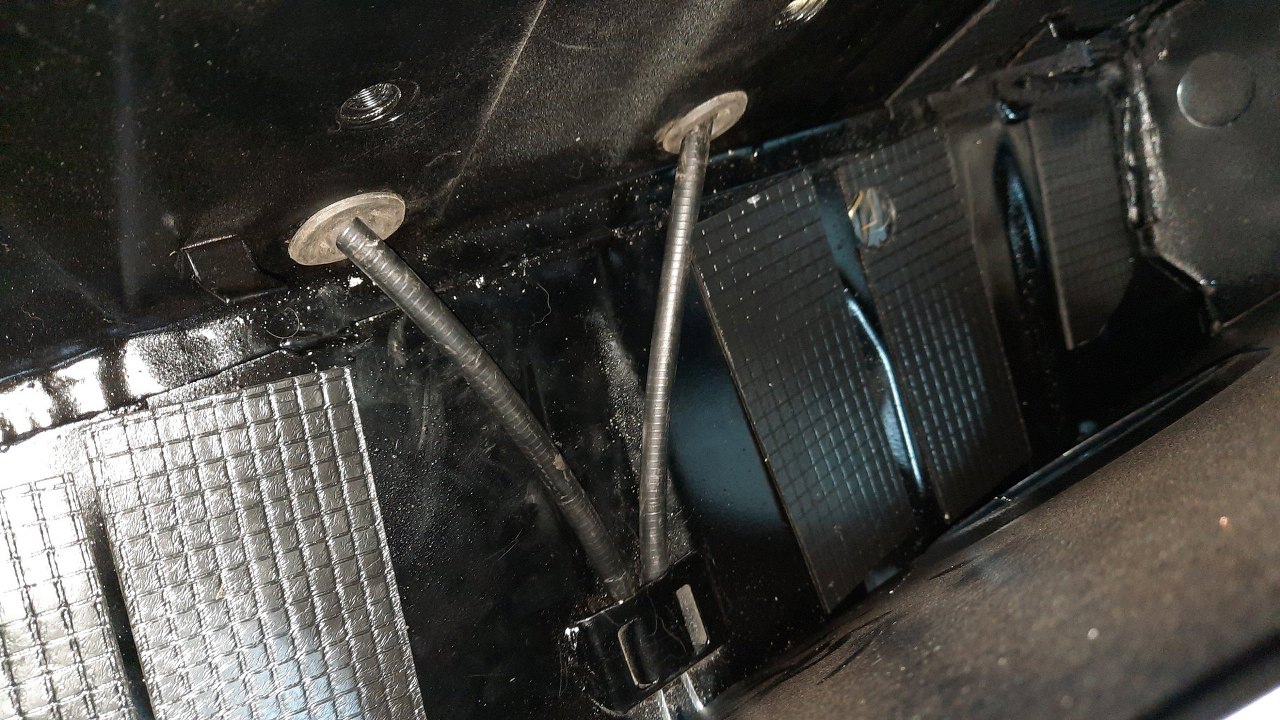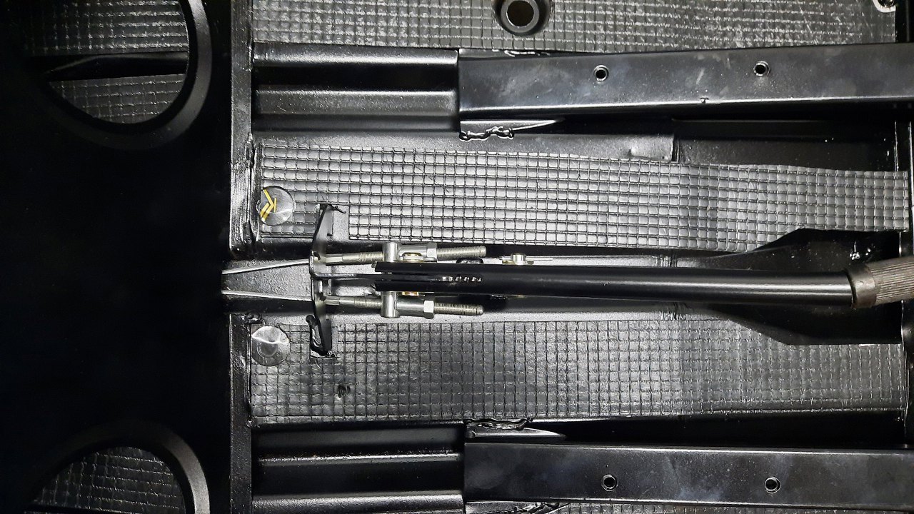 Potem przeplotłem linki hamulca ręcznego przez otwory w podwoziu i przykręciłem mocowanie środkowej gumy zawieszenia.