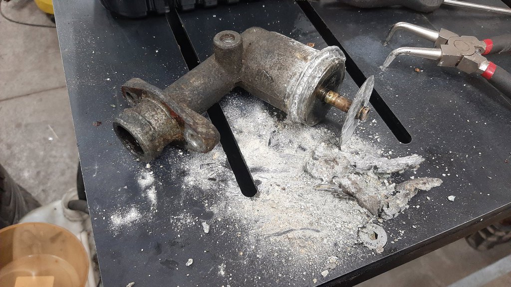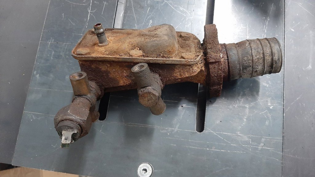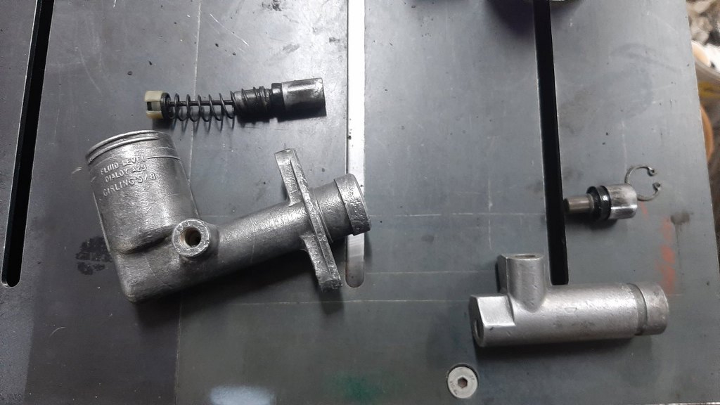Zabrałem się też za temat hamulców i sprzęgła. I ten temat ciągnął się praktycznie od samego momentu rozłożenia samochodu. Tak wyglądała pompa hamulcowa wyciągnięta z Sonetta.
