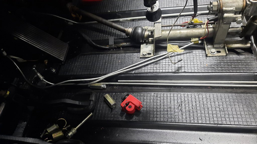 Pompę pomalowałem, żeby nie była za chwilę zardzewiała, a rurki oddałem do ocynku. Na zdjęciu widać jeszcze kilka części potrzebnych do konwersji - adapter pompy do karoserii (ta płytka), trójnik plastikowy (rozdziela jedną rurkę ze zbiorniczka płynu na dwa wejścia w pompie) i dorobiony dłuższy popychacz przykręcany do pedału hamulca.