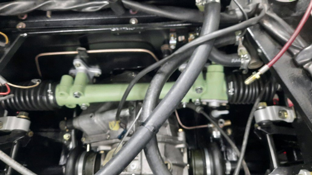 Tu widać szerzej komorę silnika, zwróć uwagę na ten przewód hamulcowy nad przekładnią kierowniczą. To już jest nowa wersja, przy pompie zmieniłem jego przebieg, żeby dalej omijał linkę prędkościomierza.