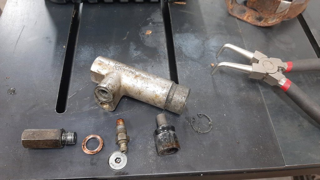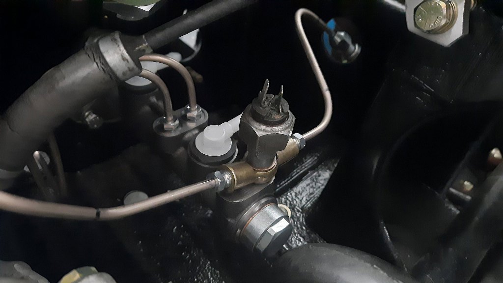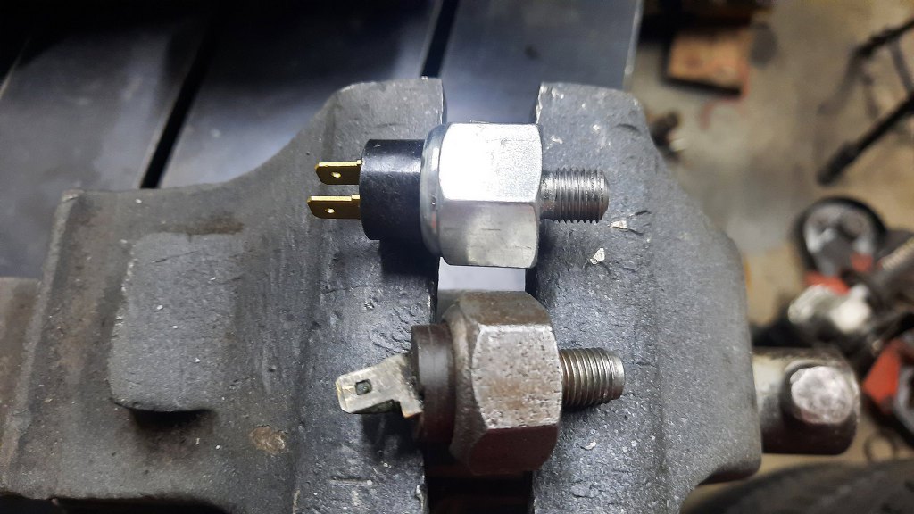 Tyle, że oryginalny czujnik STOP jest już nieco przechodzony... Kupiłem nowy, od czegoś zupełnie innego, ale niestety ma dwie różnice. Nie ma stożka na końcu, służącego do jego uszczelnienia w króćcu, ma też inny gwint. Ale zaraz... Ma gwint M10x1mm, a oryginał ma 3/8"-24. 3/8" to 9,5mm, może się uda? Tak, udało się - przegwintowałem czujnik na gwint 3/8"-24 i śladu nie ma, że to nieoryginalny gwint :). A brak stożka... zastąpiłem ten sposób uszczelnienia prostą podkładką miedzianą.