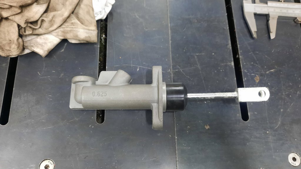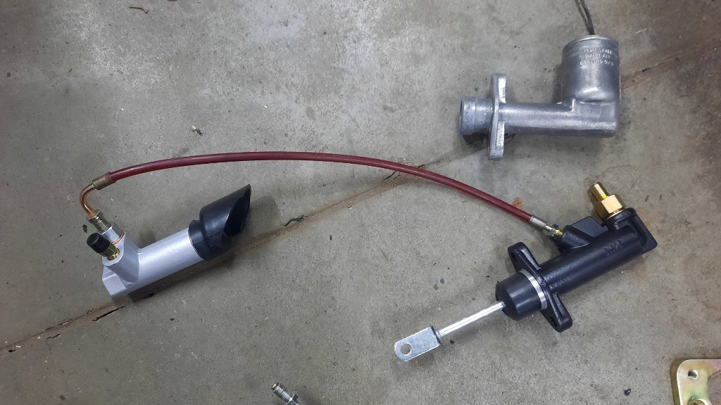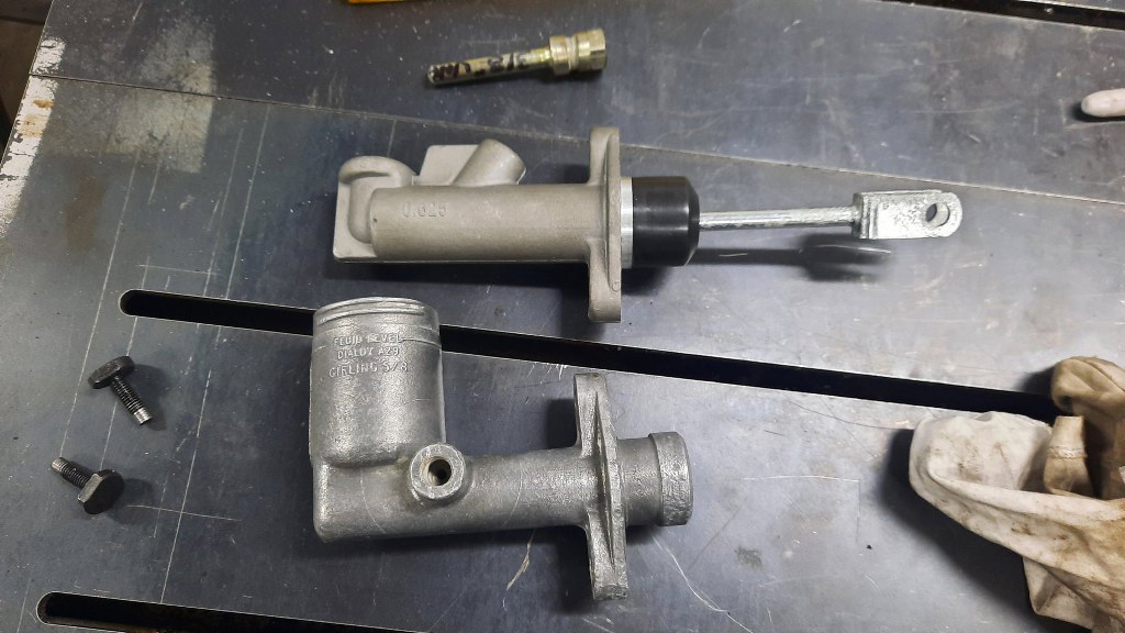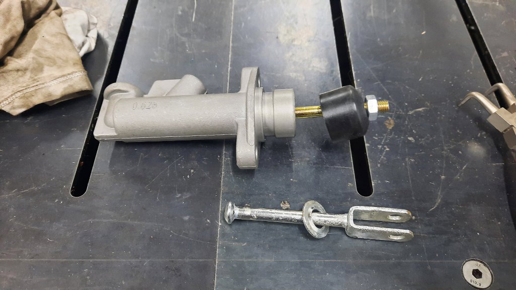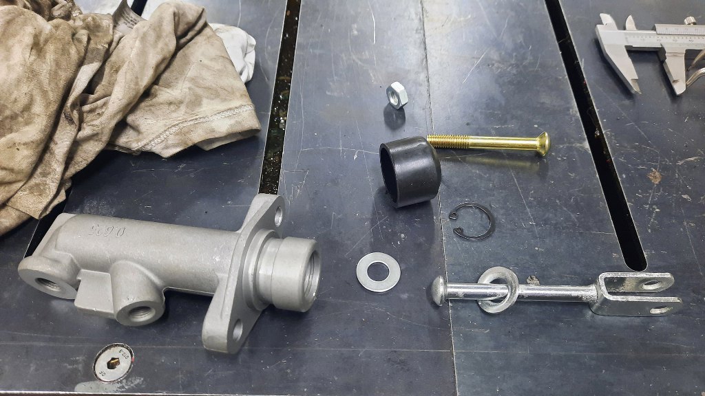 I z wysprzęglikiem nie ma większego problemu, są dostępne nowe. Z pompą gorzej - nowych nie ma od dawna, a pasujące Girlinga są obecnie niedostępne. Znalazłem więc pompę opisaną jako pompa hamulca ręcznego (drift, kjs itp). Ma ona jednak identyczną, co wymagana, średnicę tłoczka. Oczywiście ma inne wyjście, ale to nie problem. Poniżej widać oryginalny pręt mocujący ją do pedału sprzęgła.