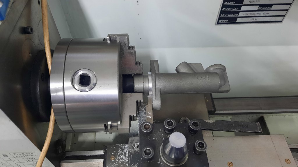 Następna rzecz do przerobienia, to średnica pompy i otwór w karoserii. Rozstaw śrub jest właściwy, ale pompa ma o 1mm za dużą średnicę. To też dość łatwo poprawić na tokarce.