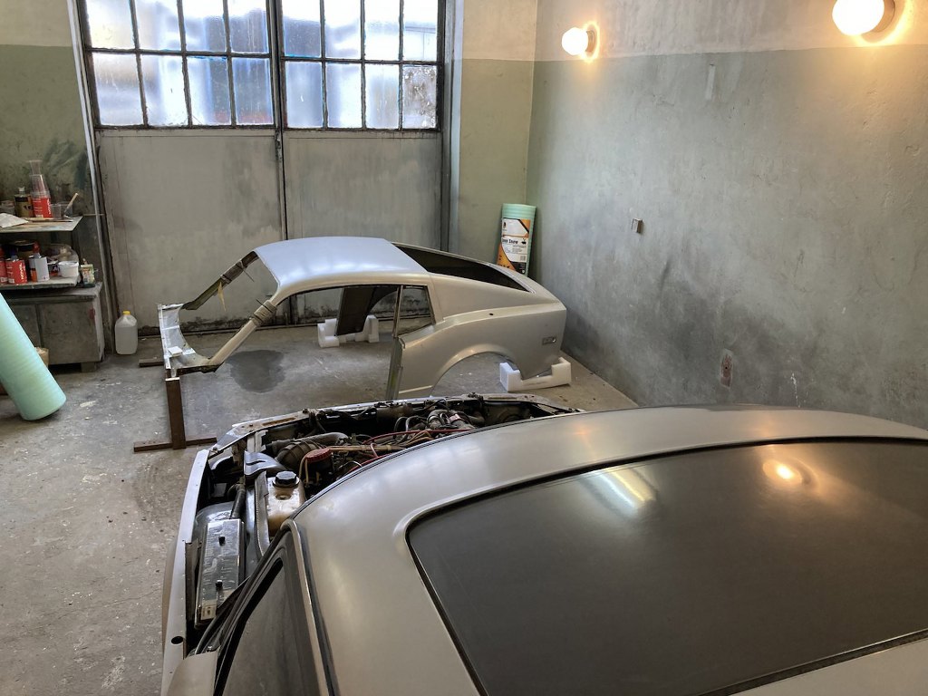 Jakoś na przełomie października i listopada skorupka Saaba Sonetta została przewieziona do zaprzyjaźnionego lakiernika, który ma doprowadzić to do stanu używalności. Jak widać po samochodzie z pierwszego planu, dobrze trafiliśmy :). Sonett wygląda tu jak Sonecik, dopiero teraz dobrze widać jaki to jest mały samochodzik.