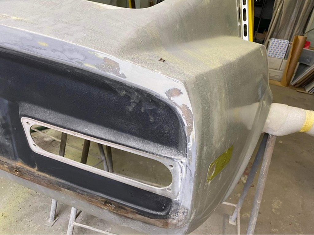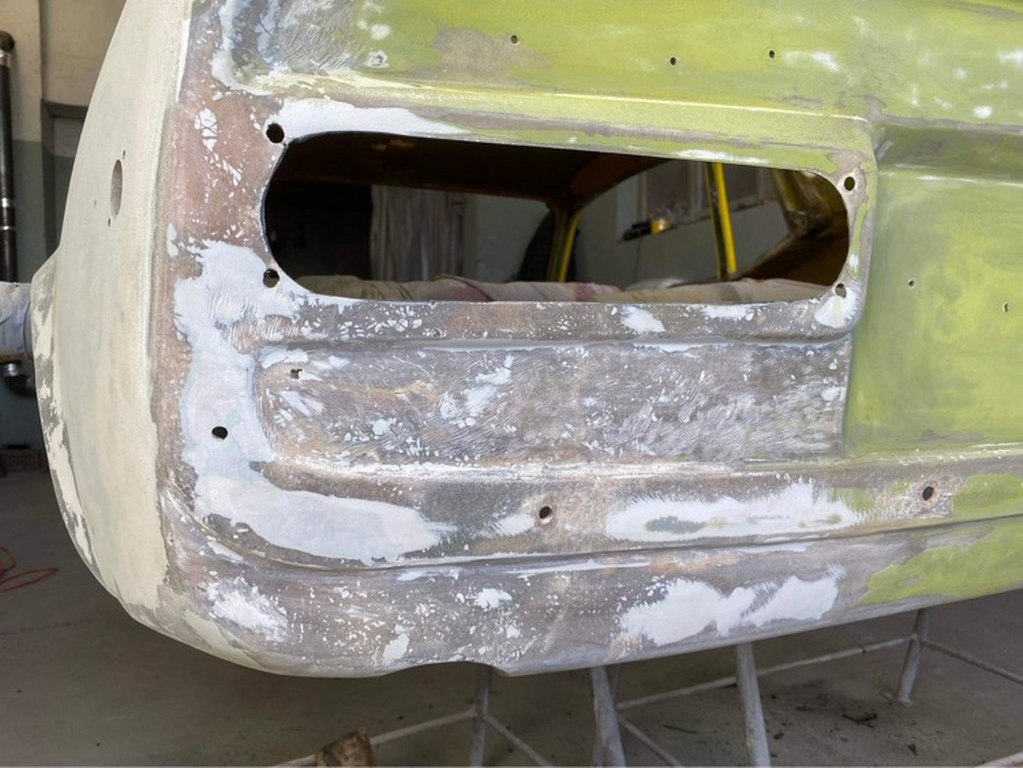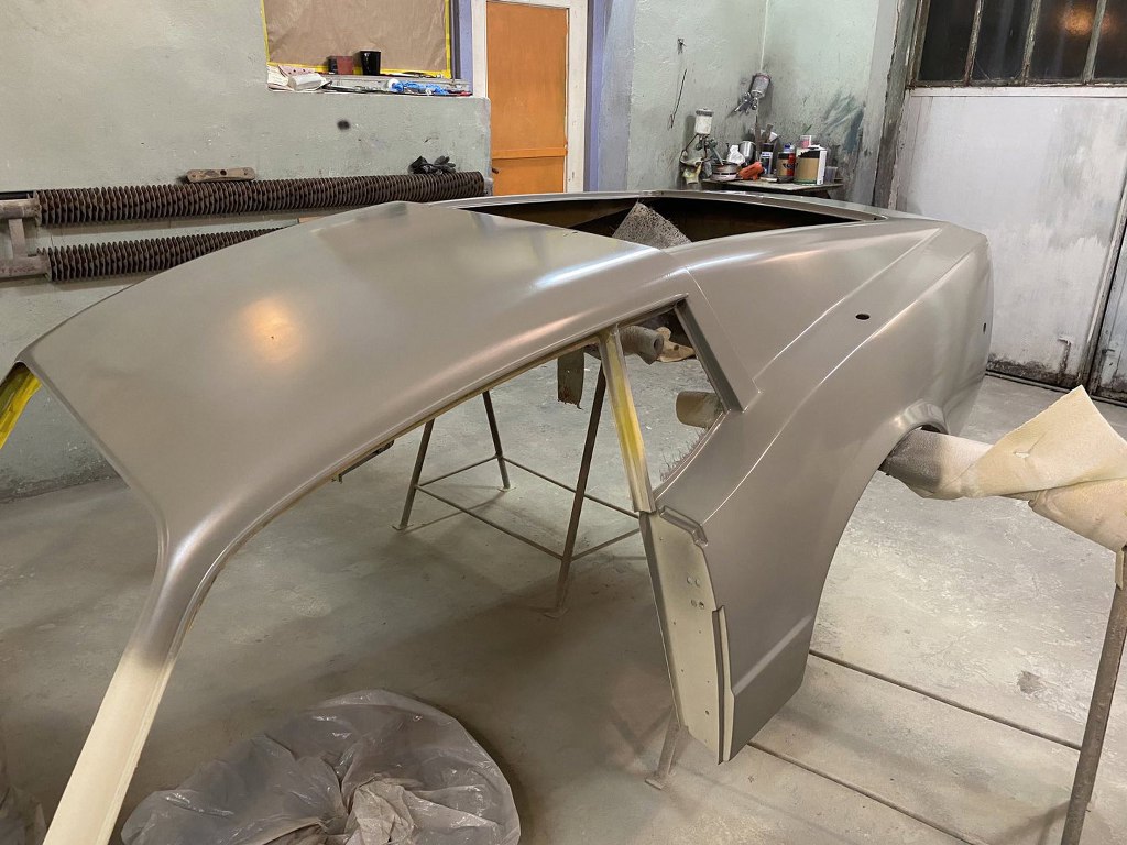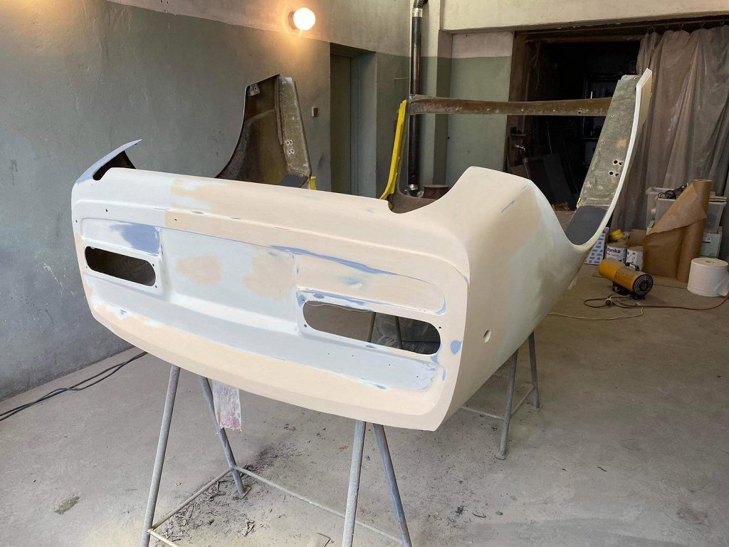 Tomek od razu wziął się do roboty i już w ciągu pierwszych kilku dni zdarł całą masę lakieru i szpachli z karoserii. Najgorszy jest lewy tylny narożnik, który musiał być kiedyś uderzony. Z tej strony szpachla jest nawalona betoniarką. Inna sprawa, że to musi tak zostać, żeby strony były symetryczne. Ale w sumie szpachla na laminacie nie przeszkadza tak, jak na stali :).