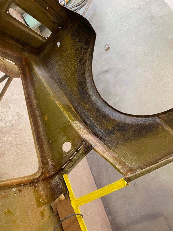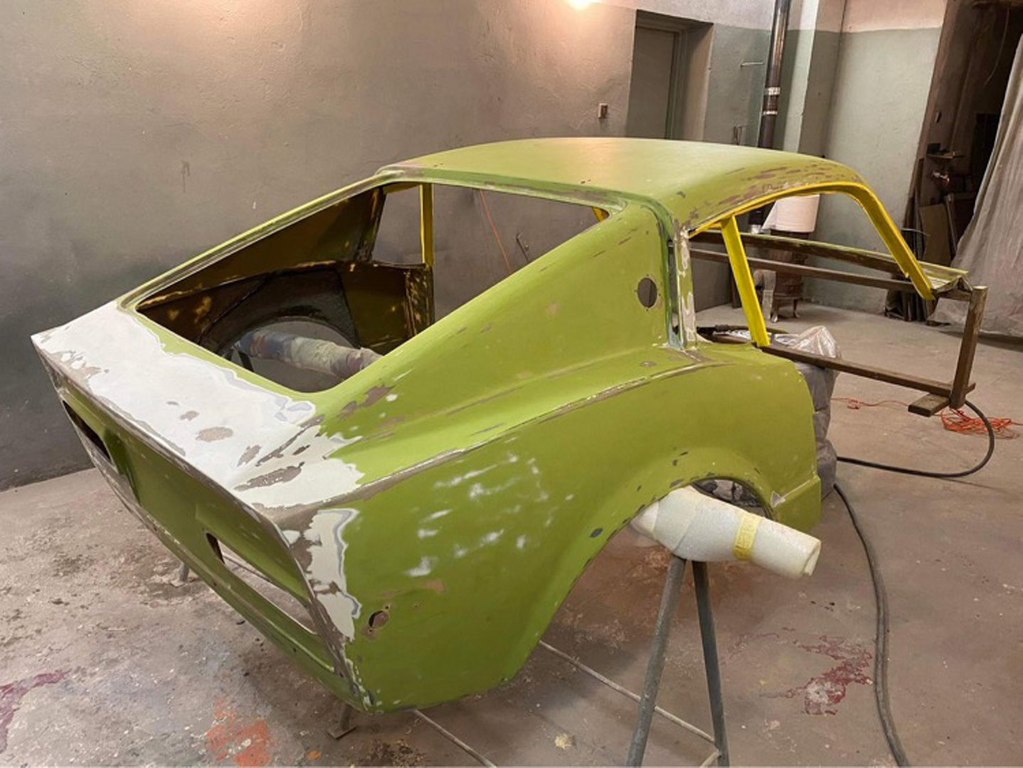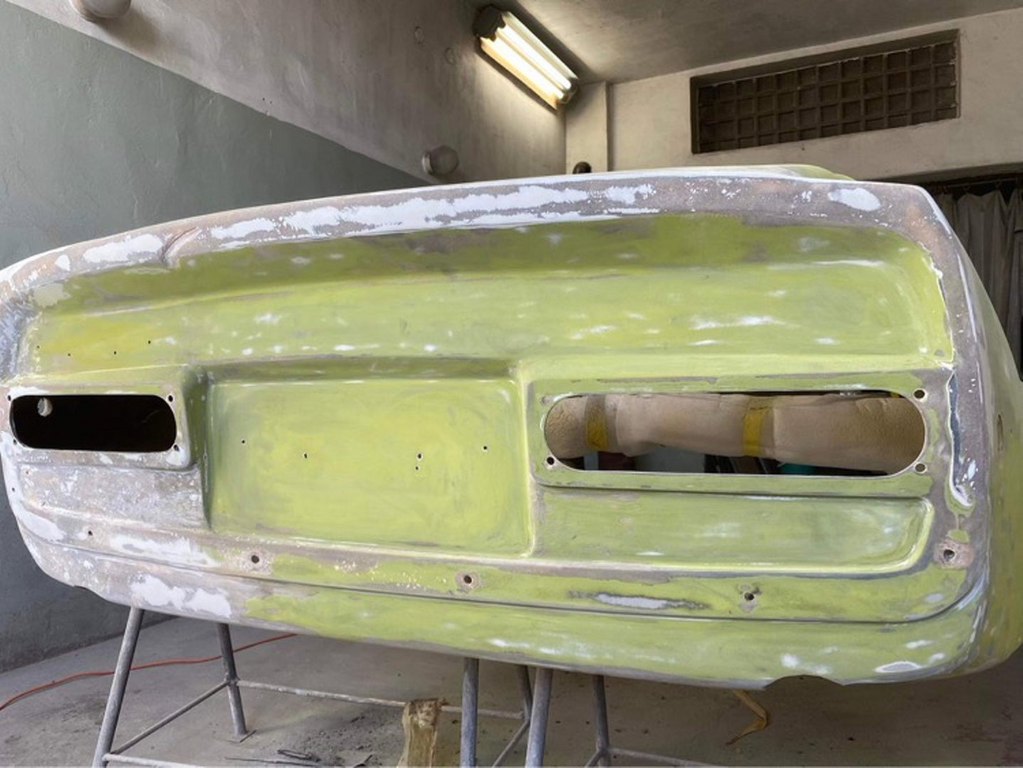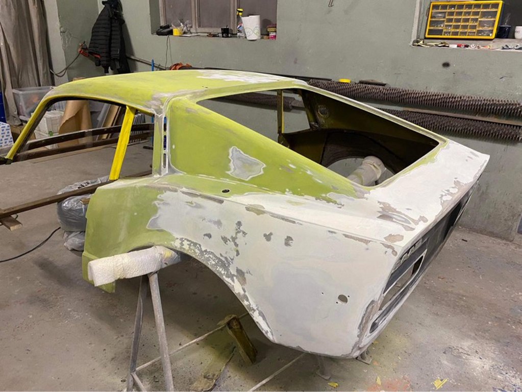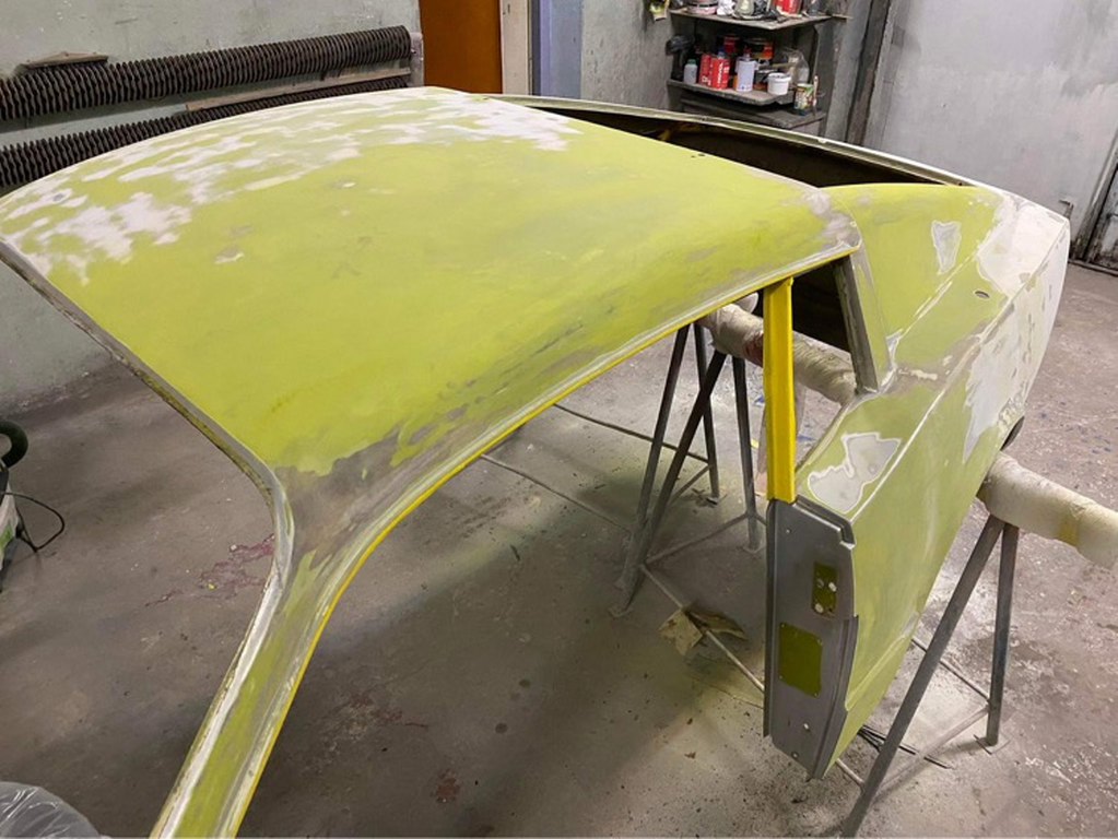 Tomek od razu wziął się do roboty i już w ciągu pierwszych kilku dni zdarł całą masę lakieru i szpachli z karoserii. Najgorszy jest lewy tylny narożnik, który musiał być kiedyś uderzony. Z tej strony szpachla jest nawalona betoniarką. Inna sprawa, że to musi tak zostać, żeby strony były symetryczne. Ale w sumie szpachla na laminacie nie przeszkadza tak, jak na stali :).