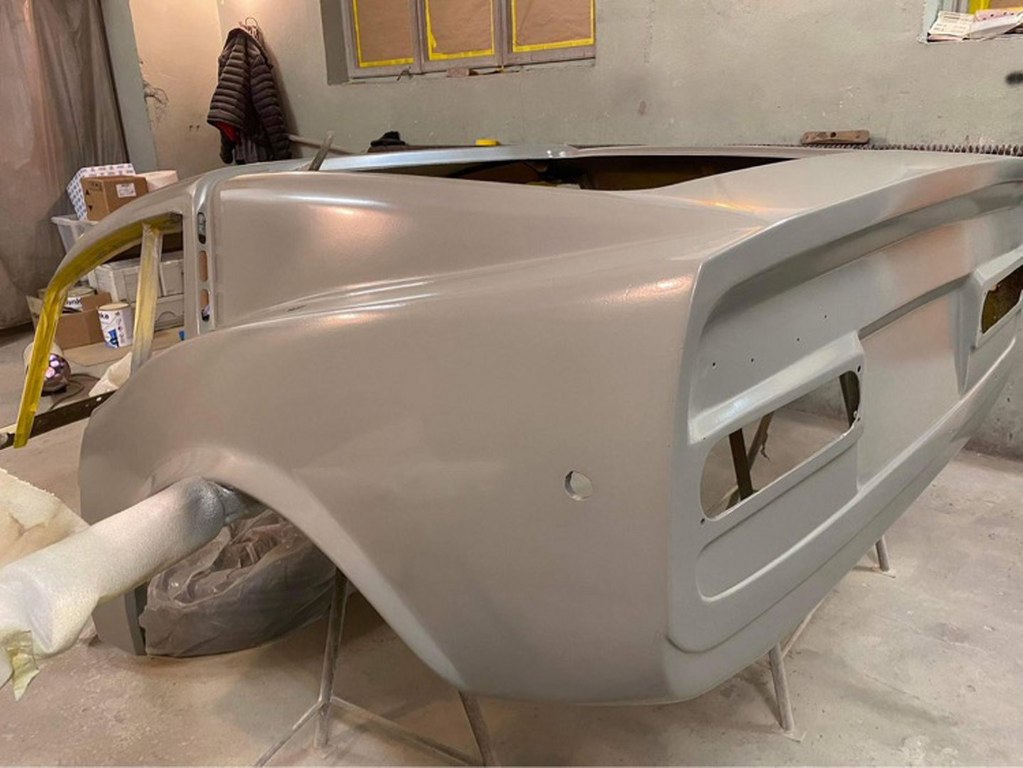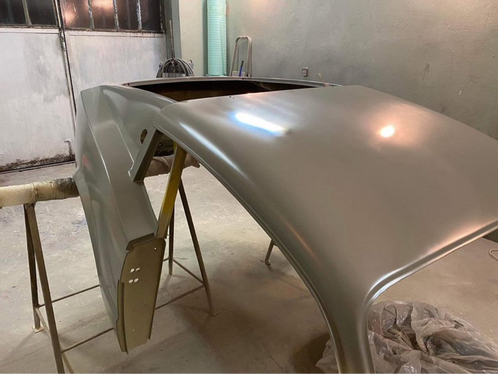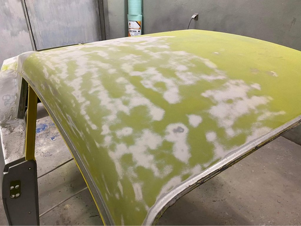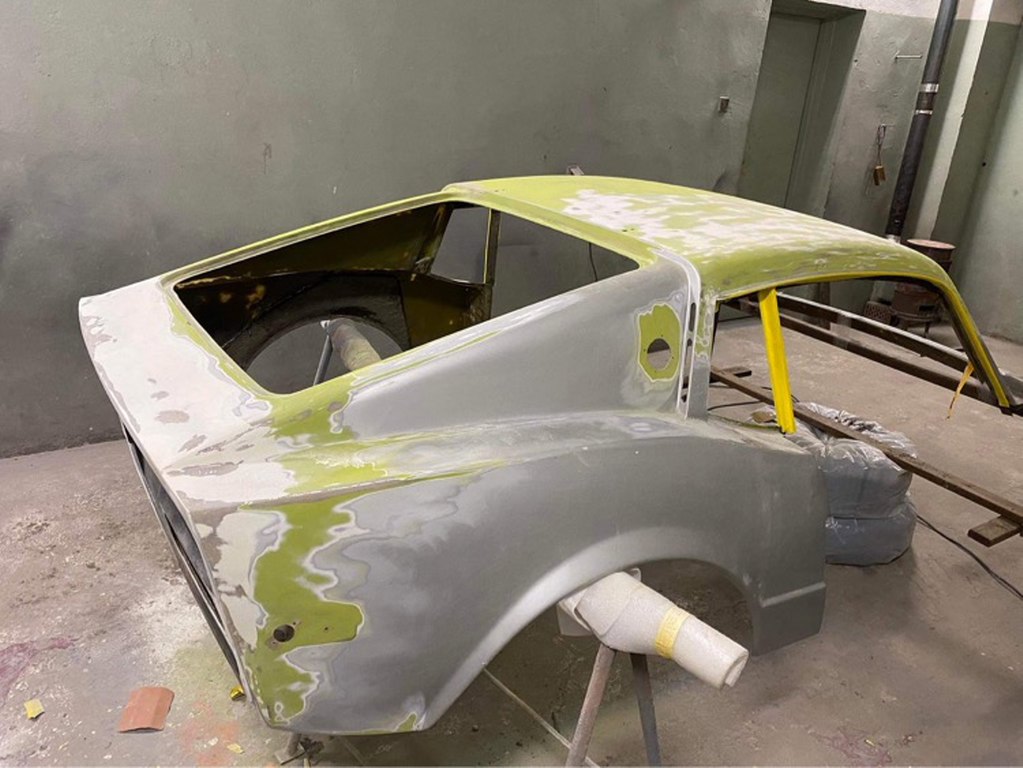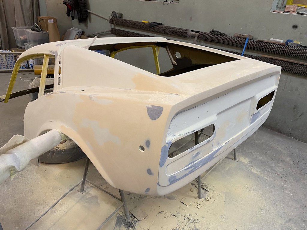 Po wstępnym wyprowadzeniu nadwozia położona została szpachla natryskowa.