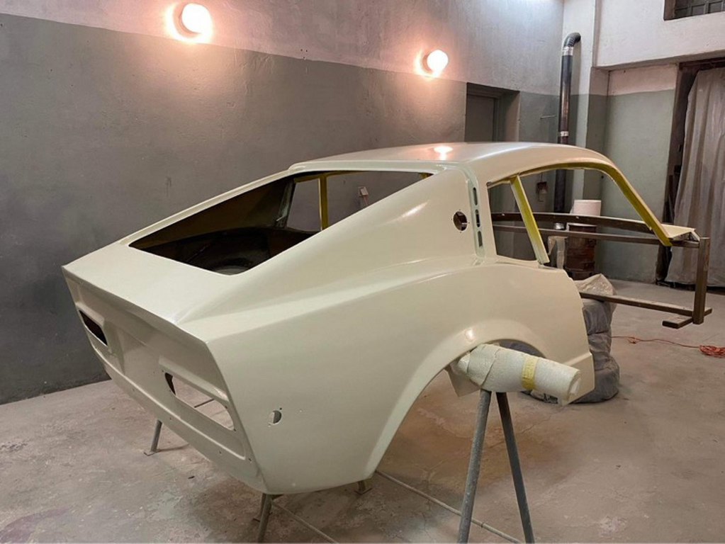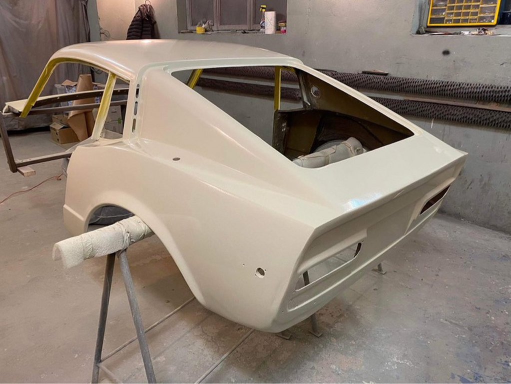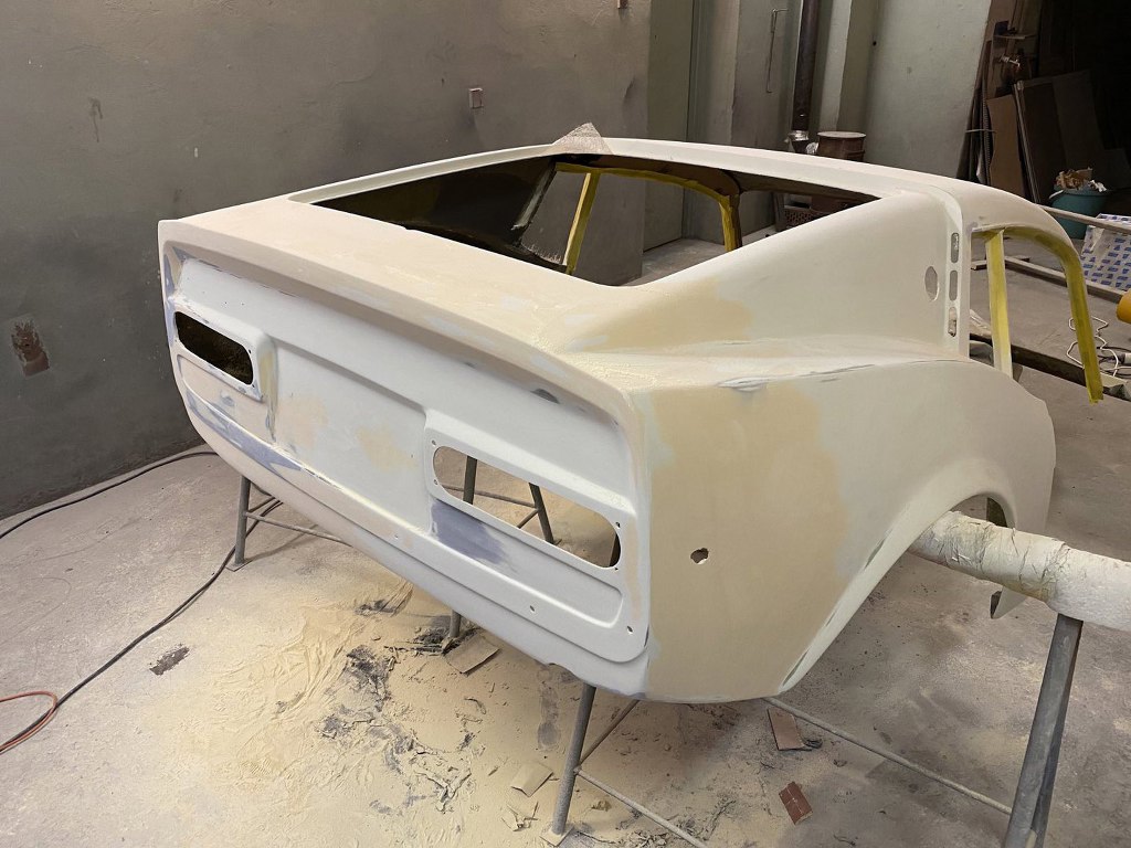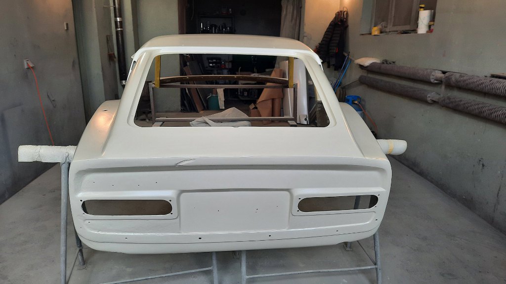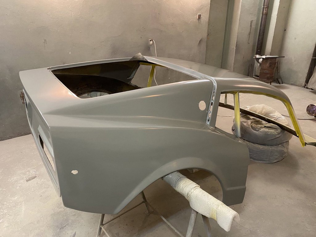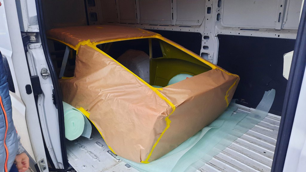Chyba pominąłem etap wyprowadzania na gotowo nadwozia i kładzenia ostatniej warstwy podkładu, ale aż tak się nie znam, żeby wychwycić to ze zdjęć, a też i pewnie wszystkich zdjęć nie mam :). W każdym razie nadwozie zostało wyprowadzone pod lakier i pomalowane od wewnątrz (żeby zamknąć laminat lakierem) i, po zabezpieczeniu, przyjechało do mnie.