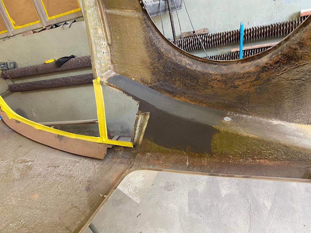 Potem karoseria została przewrócona do góry nogami i Tomek połatał uszkodzenia wewnątrz laminatu. Tu też była cała masa pracy przy drobnych pęknięciach, rozwarstwieniach itp. W paru miejscach laminat został wzmocniony dodatkową warstwą włókna.
