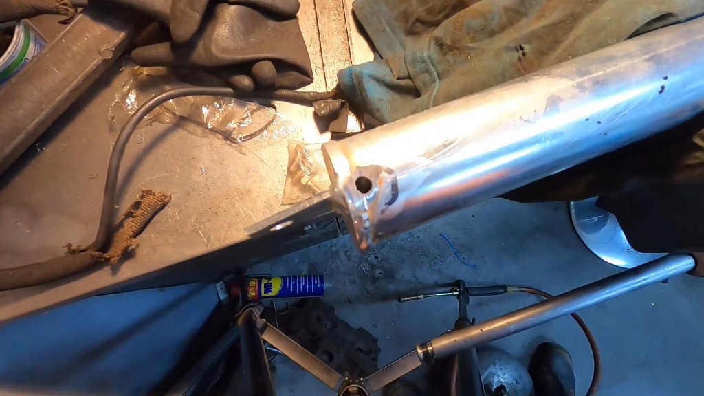 Po ocynkowaniu okazało się, że wyszła jedna mikroskopijna dziurka. Dziurka okazała się nieszczelnością pomiędzy lutem a zbiorniczkiem. Po zdjęciu lutu, czyli cyny, znalazłem piękny, niepotrzebny tu otwór.