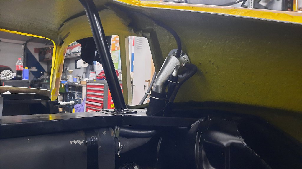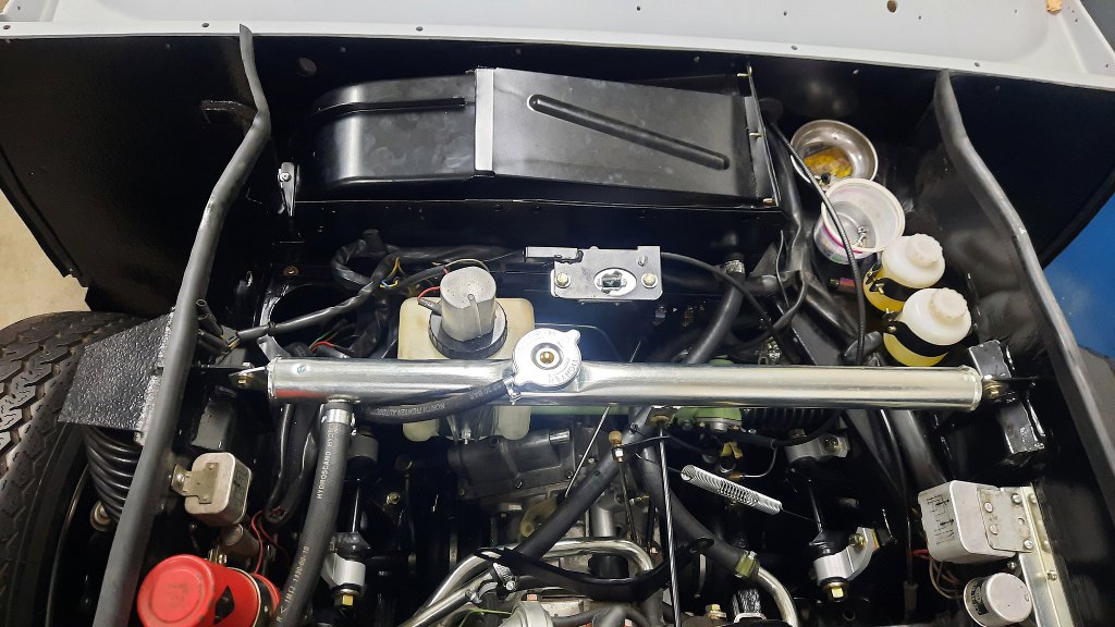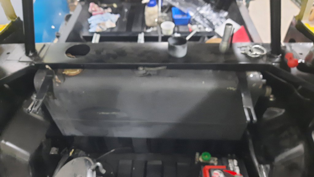 Zacznę jednak od drugiej strony układu - w komorze silnika jest puszka pochłaniacza par paliwa. Do niej doprowadzane są opary z komory pływakowej gaźnika - tego jeszcze nie podłączam. Podłączona rurka ma odpowietrzać zbiornik paliwa. Idzie ona przy zbiorniczkach płynu aż do grodzi.