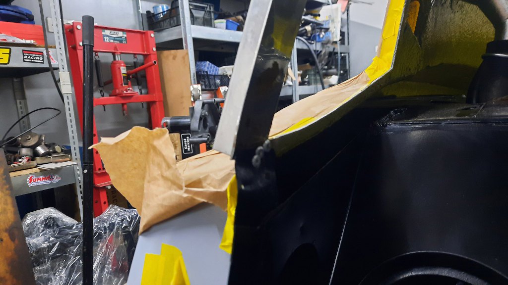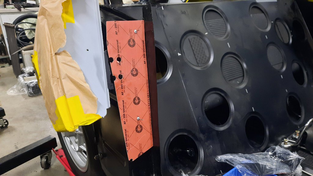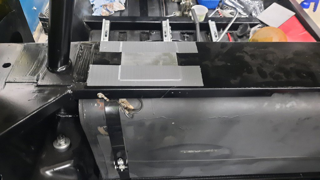 Druga rzecz do zrobienia przed założeniem karoserii - pod słupkami B, tam, gdzie zatrzask zamka drzwi, były podkładki z dykty, pomiędzy blachą podwozia a laminatem nadwozia. Są w stanie średnim, ale podejrzewam, że tak wyjechały z fabryki. Mam zresztą tylko jedną, drugiej nie było. Dziwne. Muszę dorobić. Nie mam dykty, ale znalazłem bardzo gruby materiał uszczelkowy.