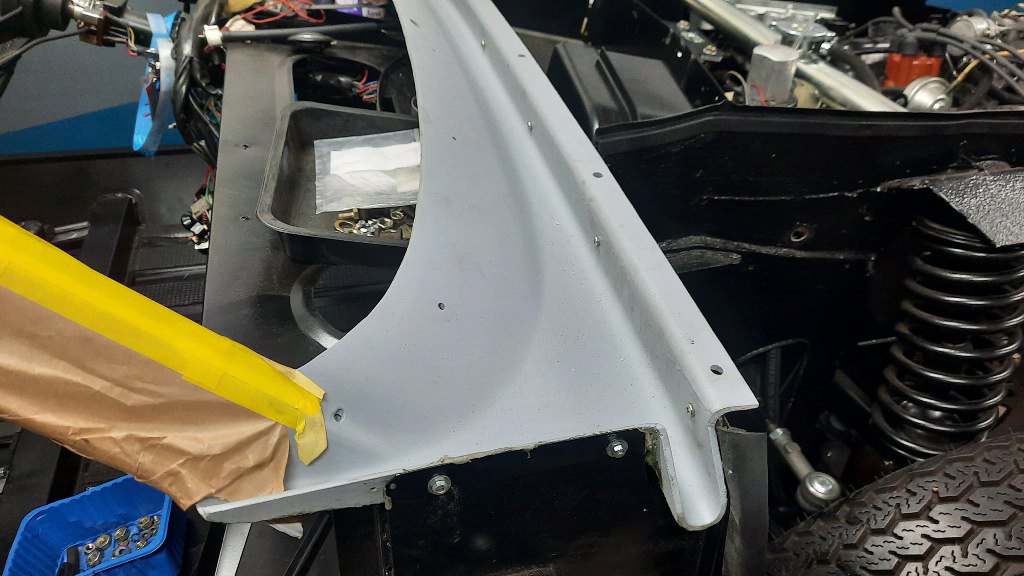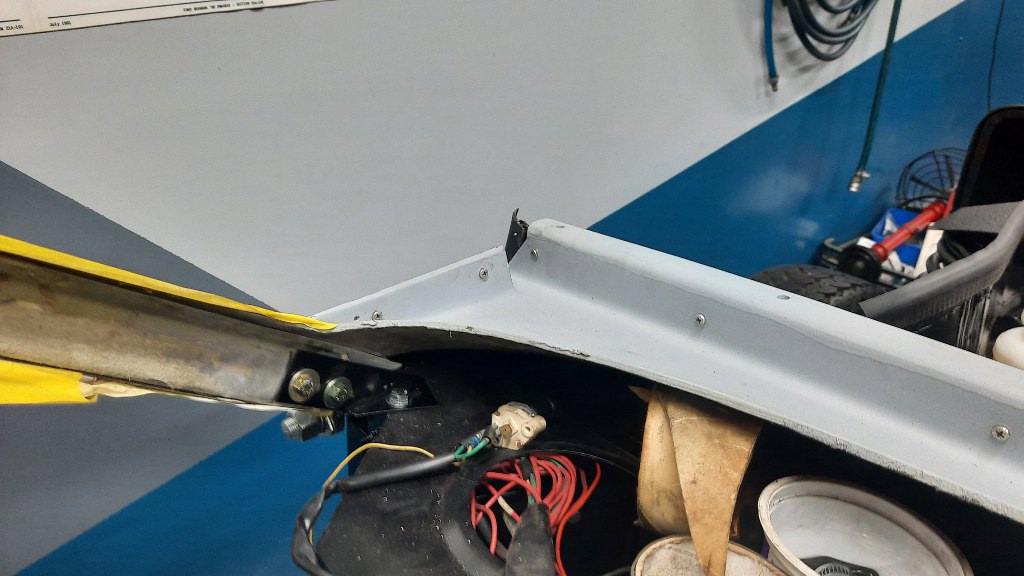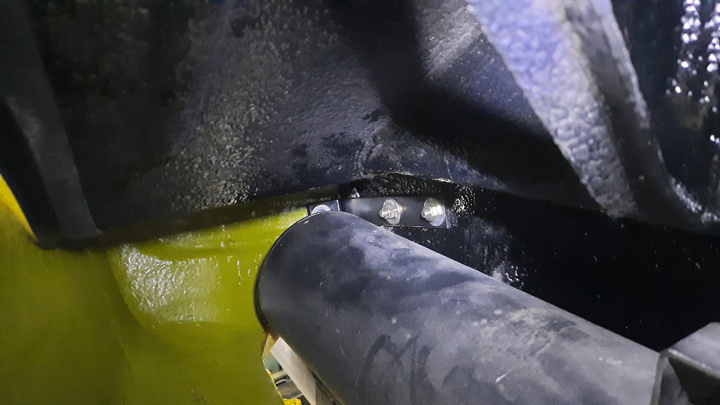 Widać, że skręciłem to po całej długości przodu. Z tej strony cały słupek A był wymieniony, więc otwory na śrubki musiałem nawiercić nowe. Widać też wewnątrz przykręcony kątownik łączący słupek z podwoziem.