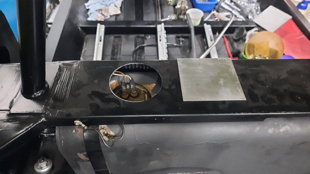 Po przykręceniu zbiornika z powrotem na miejsce znalazłem jeszcze tą blaszkę aluminiową. Ma ona zakryć otwór obok. Otwór służy do dostępu do kabelków czujnika poziomu paliwa.