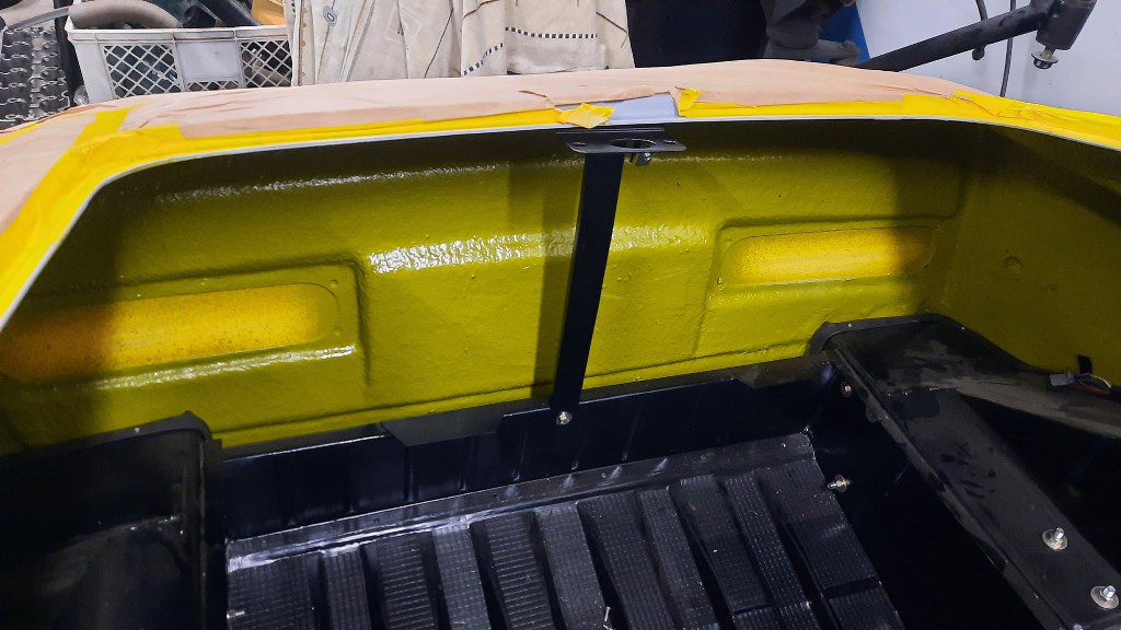I na końcu wspornik tyłu. Na nim też jest zamek tylnej klapy, pokazywałem to wcześniej. Tu widać gdzie to jest w samochodzie. Usztywnia to nieco laminat z tyłu samochodu. I to na razie jest ostatnia rzecz mocująca nadwozie, którą przykręcam. Reszta po lakierowaniu.