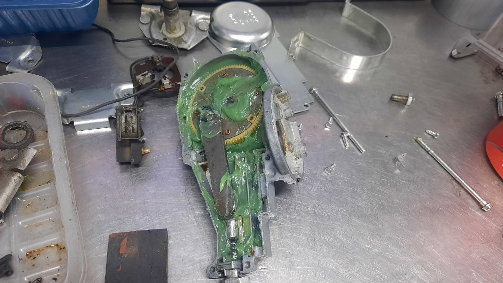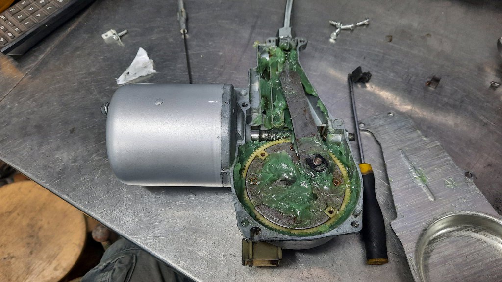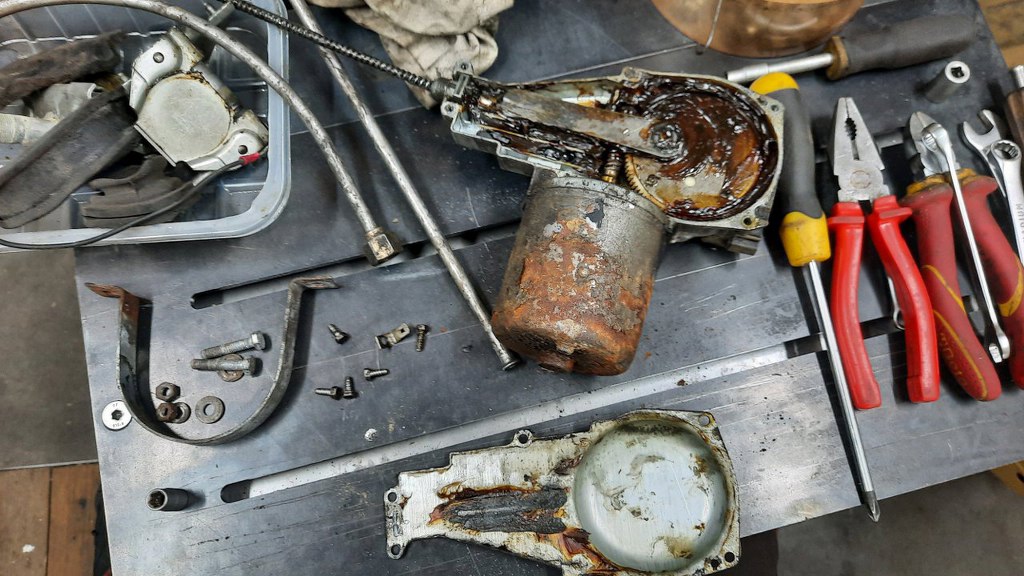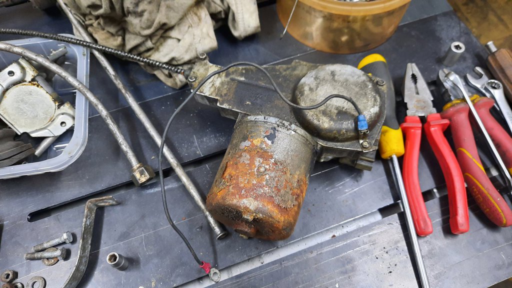 Od pewnego czasu ciągnąłem również temat odnowienia mechanizmu wycieraczek. W sumie, jest to do tej pory najbardziej złożony mechanizm, który tu robię. No może oprócz silnika. I skrzyni. I elektryki. No dobra, nie jest taki skomplikowany, ale części ma sporo i wcale nie jest taki prosty do zrobienia. Tuż po wyjęciu z samochodu mam taki stan wyjściowy.