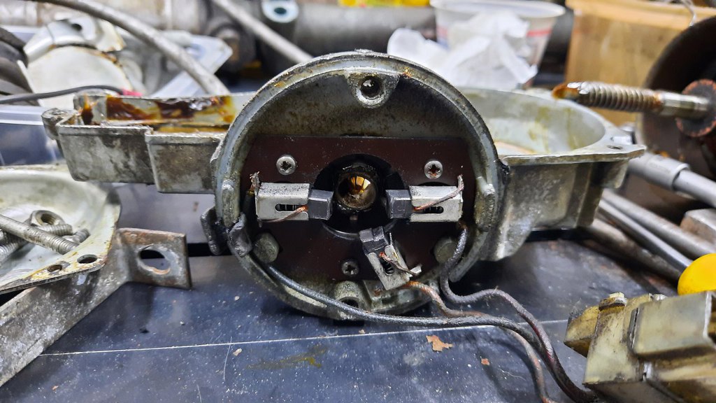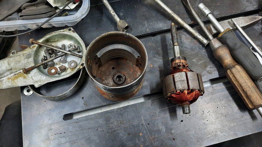 Obudowa silniczka jest mocno skorodowana. Widać jeszcze ślady oryginalnego (chyba?) malowania. Tego raczej nie odwzoruję, nie mogę znaleźć takiej farby młotkowej. Zresztą jest to mocno schowane, a na zlotach pyrystów ludzie muszą się mieć do czego przyczepić.