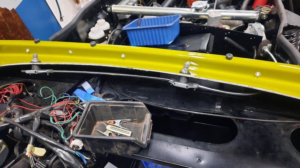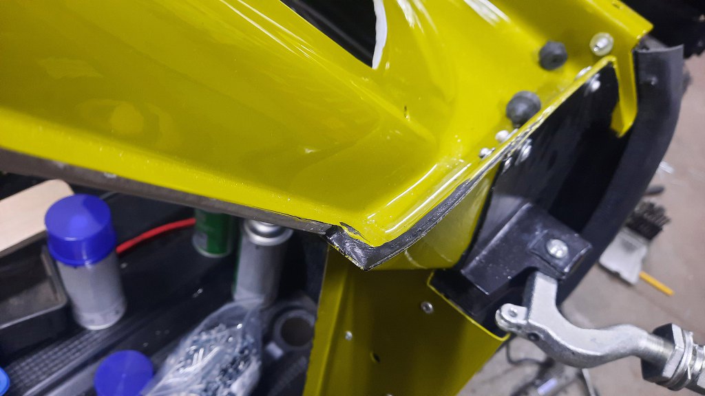 I kolejną pokrywę :). Wszystko skręciłem oryginalnymi wkrętami. Pomiędzy blachami jest masa uszczelniająca. Włożyłem też nowe gumki w podszybie, na których będzie leżała przednia część karoserii.
