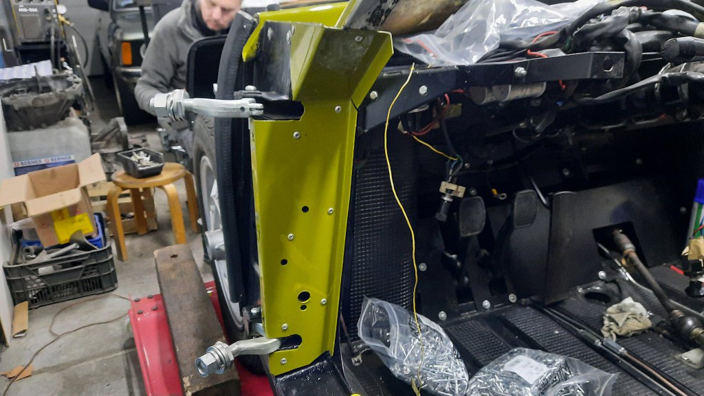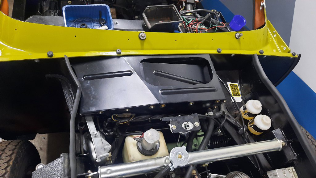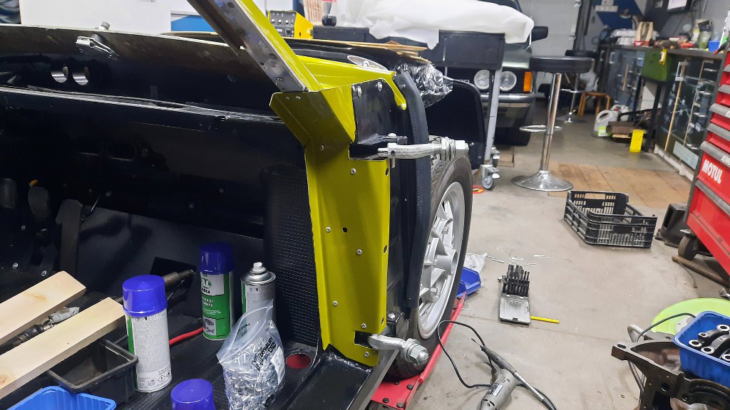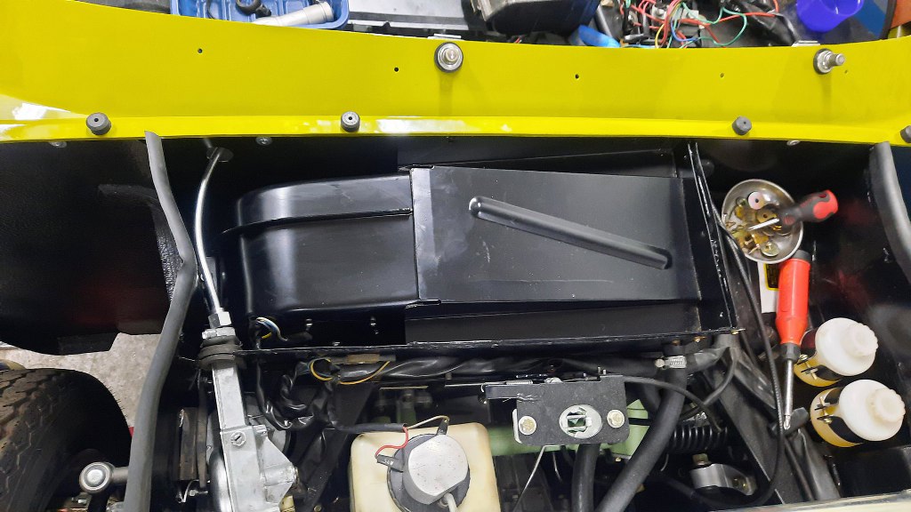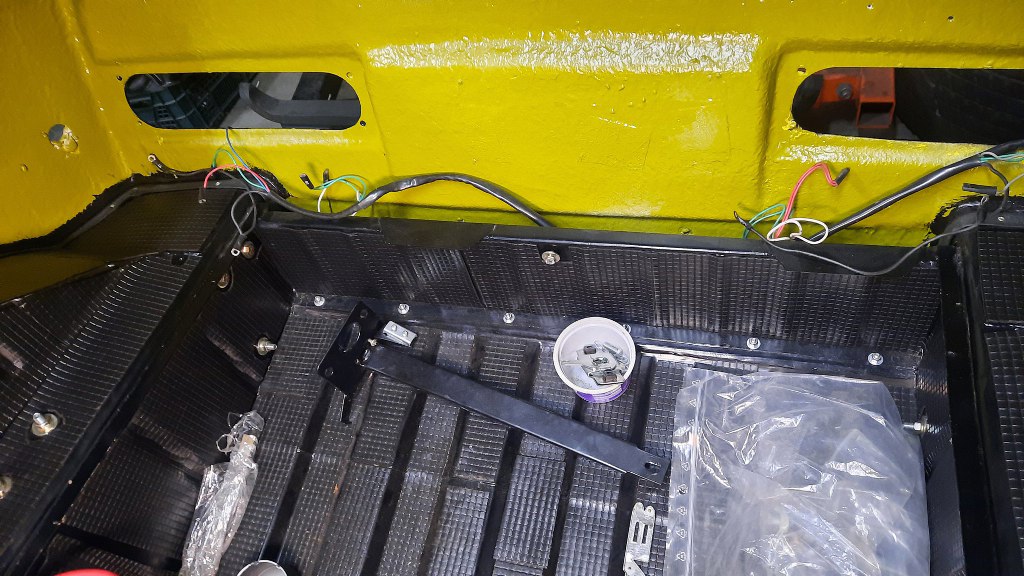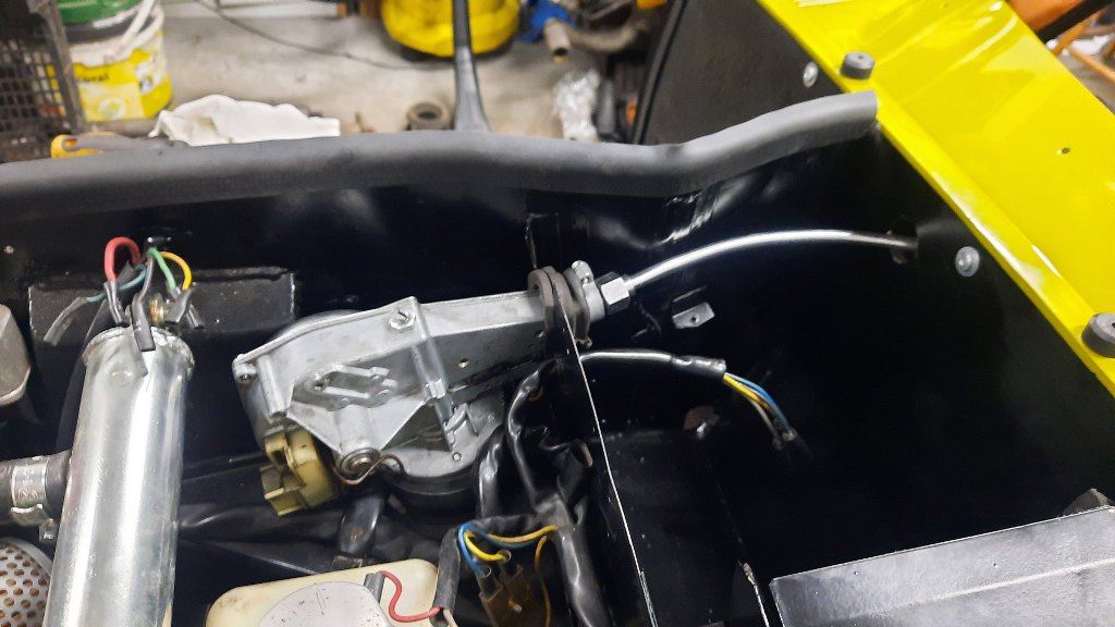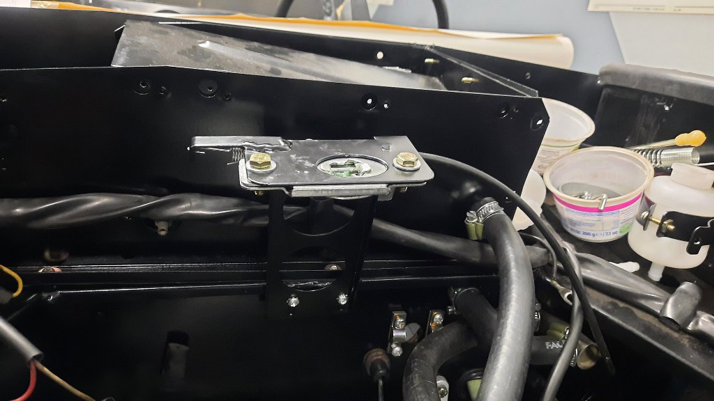 Widać to już było wcześniej, ale przykręciłem i podłączyłem do linki mechanizm otwierania maski. Później będzie dokładniej przykręcony, bo trzyma on też laminat przodu na miejscu.
