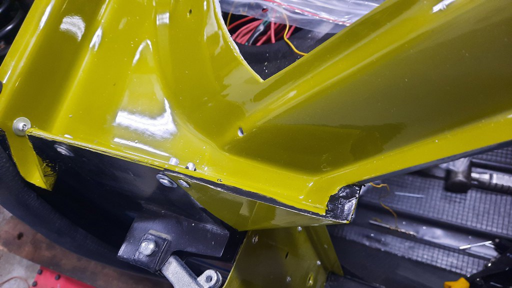 Po pomalowaniu muszę je założyć. Naciągnięcie ich tak, żeby pasowały na miejsce wymagało naprawdę sporo wysiłku. Zanitowałem je w oryginalne otwory. Całość również jest położona na masie uszczelniającej, raz, żeby było szczelne, dwa, żeby nie wibrowało.