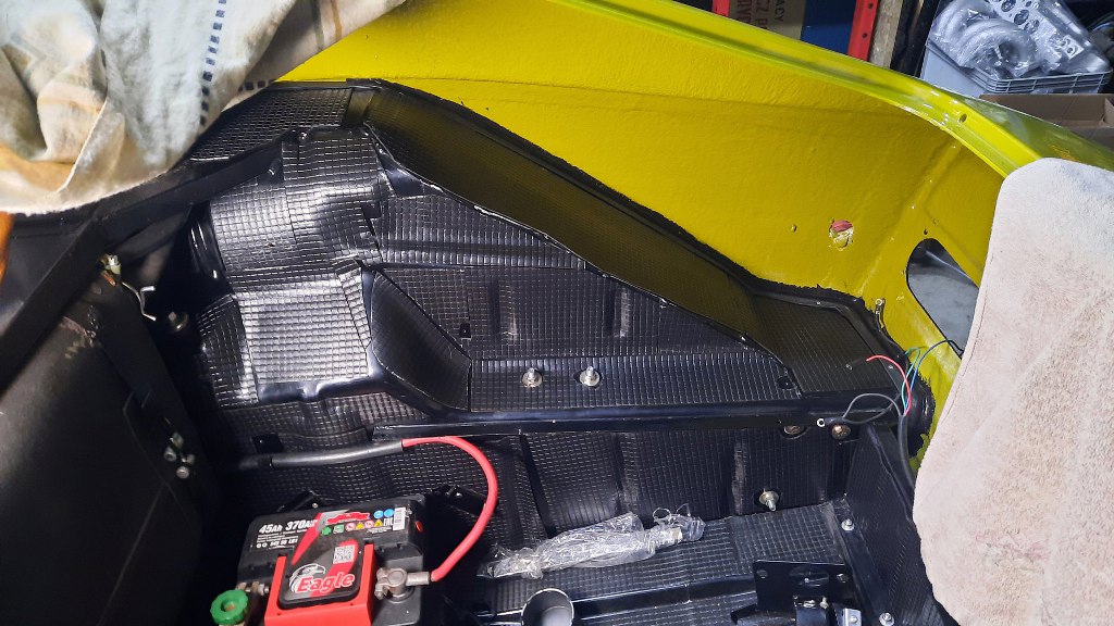 Z różnych innych rzeczy, to jeszcze włożyłem akumulator i zacząłem wyklejać resztę bagażnika matami bitumicznymi. Tu prawe nadkole.