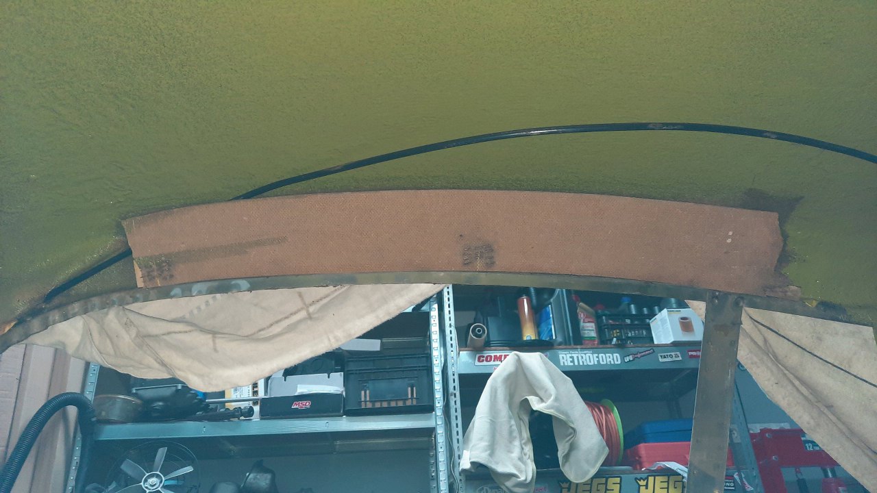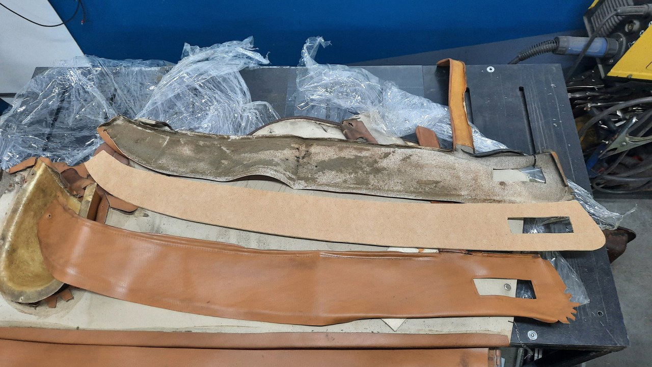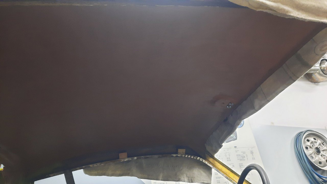 Długo nie mogłem się zebrać, żeby napisać nowe aktualizacje o Sonecie, bo nastąpił czas, gdzie dzieje się dużo, ale na różnych frontach. A to czekam aż coś wyschnie, a to czekam na części... i takie tam powody. Nie ma co jednak udawać, że nic się nie działo. Postaram się to trochę jadnek usystematyzować :). Zaczynam od tapicerki. Wojtek kupił nowy materiał na podsufitkę. Namówiłem go jednak na zachowanie starej, która była w całkiem niezłym stanie, ale była za to śliczna, z lekkimi śladami jej wieku. To stanowi o jej wartości. Razem z podsufitką są też tapicerki słupków i tapicerka nad drzwiami. Stąd materiał i tak się odkleił, tak jak podsufitka z dachu. Sama baza tego elementu to dykta widoczna na zdjęciu, a raczej to, co z niej zostało. Nad nią rurka od odpowietrzenia zbiornika paliwa.