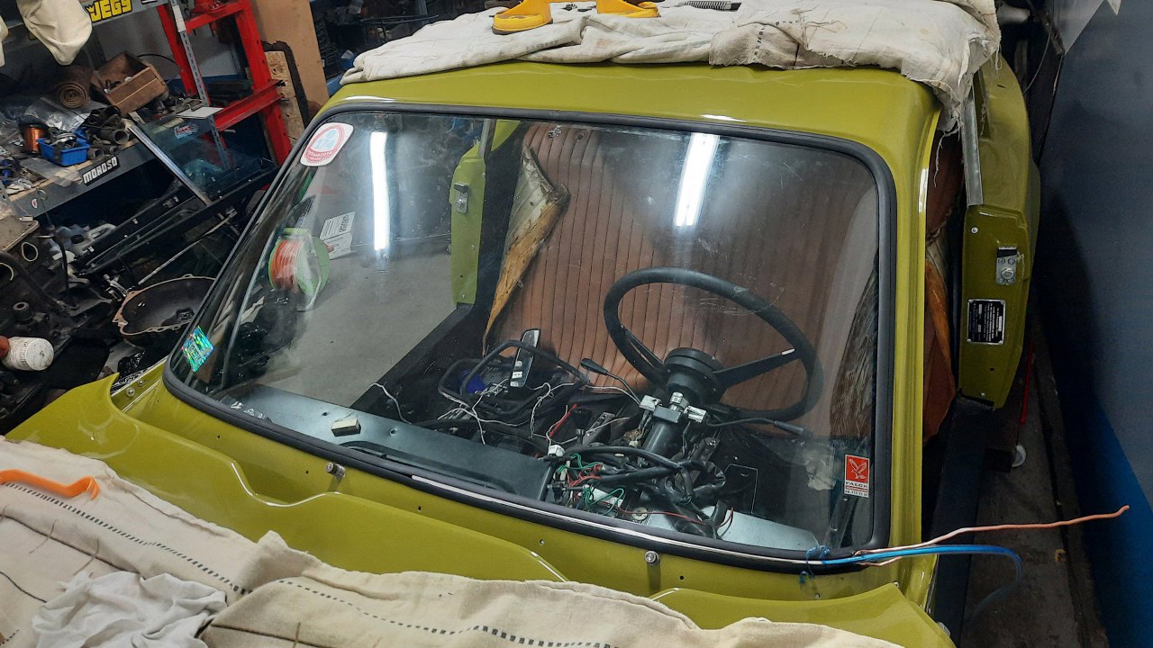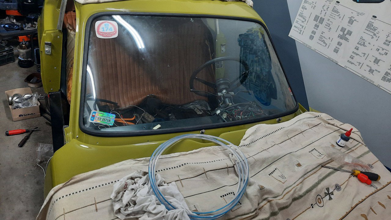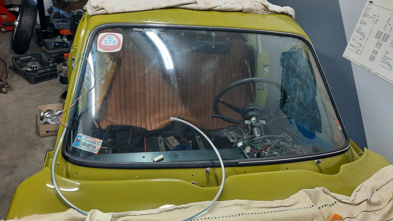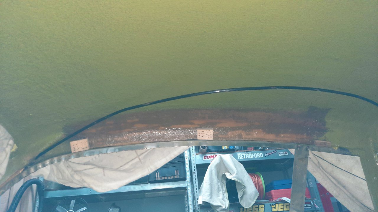 Długo nie mogłem się zebrać, żeby napisać nowe aktualizacje o Sonecie, bo nastąpił czas, gdzie dzieje się dużo, ale na różnych frontach. A to czekam aż coś wyschnie, a to czekam na części... i takie tam powody. Nie ma co jednak udawać, że nic się nie działo. Postaram się to trochę jadnek usystematyzować :). Zaczynam od tapicerki. Wojtek kupił nowy materiał na podsufitkę. Namówiłem go jednak na zachowanie starej, która była w całkiem niezłym stanie, ale była za to śliczna, z lekkimi śladami jej wieku. To stanowi o jej wartości. Razem z podsufitką są też tapicerki słupków i tapicerka nad drzwiami. Stąd materiał i tak się odkleił, tak jak podsufitka z dachu. Sama baza tego elementu to dykta widoczna na zdjęciu, a raczej to, co z niej zostało. Nad nią rurka od odpowietrzenia zbiornika paliwa.