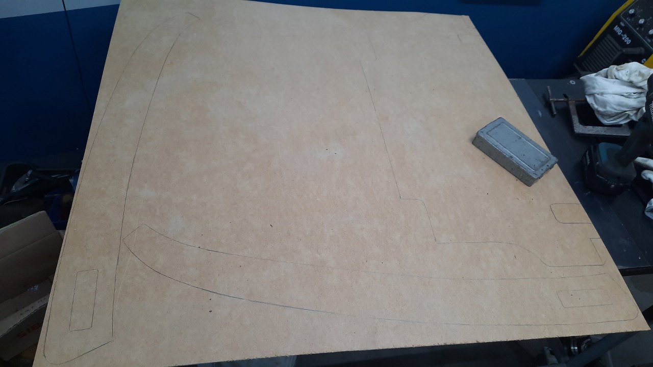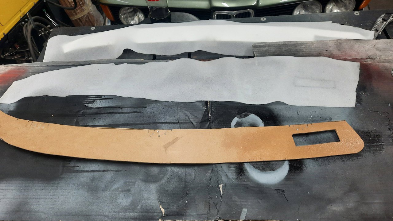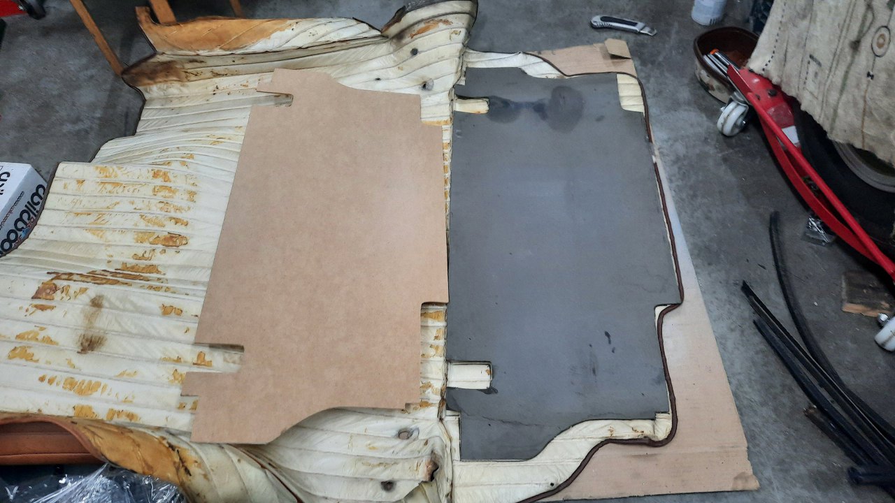 Korzystając z resztek dykty z obu stron samochodu udało się odrysować kształt na nowym kawałku dyskty. Tu już wycięty. Obok leżą oryginalne kawałki skaju.