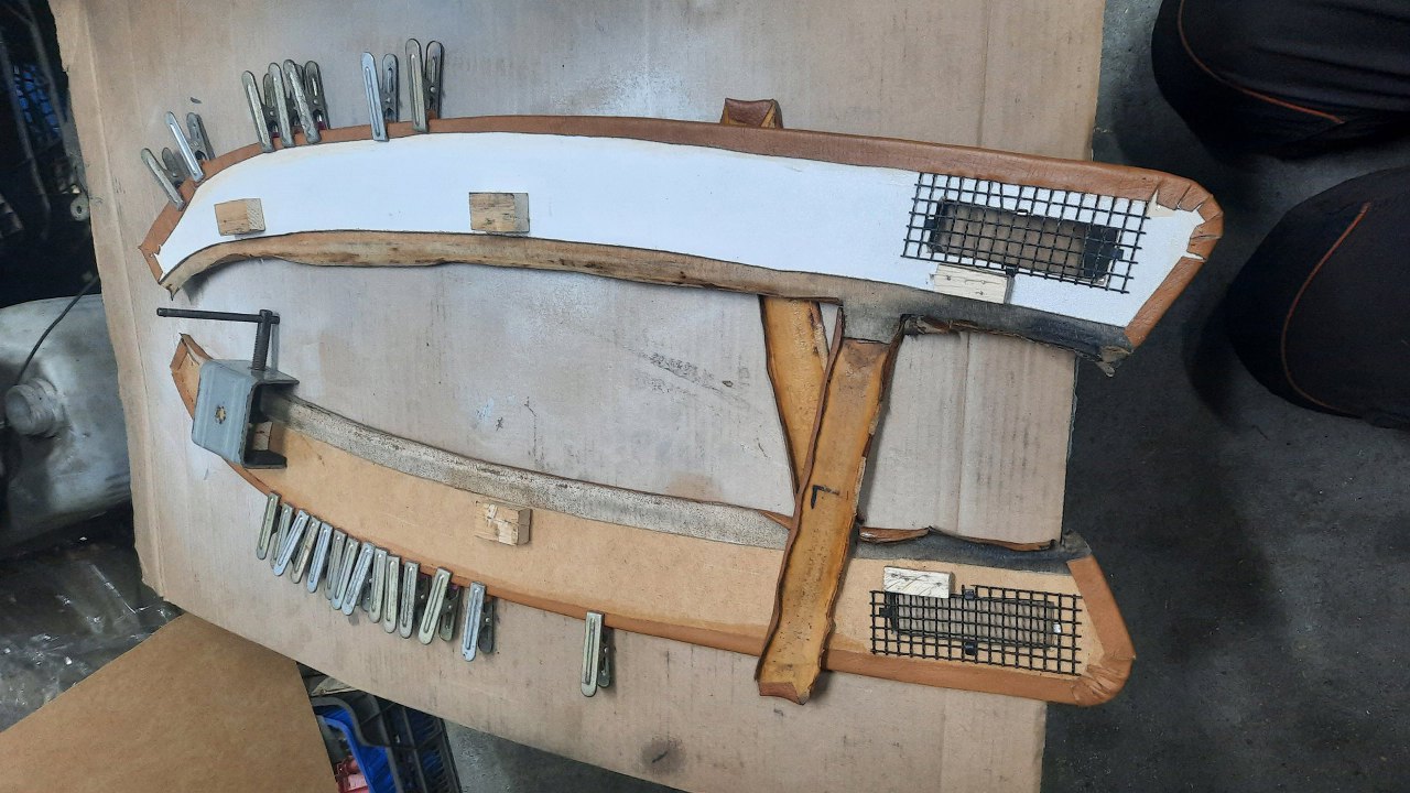Po przyklejeniu gąbek dociąłem je dokładnie do kształtu. Następnie przykleiłem oryginalny skaj. To jest najtrudniejszy moment, bo nie mogę go dociąć jak nie pasuje - muszę go przyłożyć idealnie na miejsce. Potem trzeba zachylić go na dyktę i przykleić od drugiej strony. Tu pomagam sobie radzieckimi spinaczami do bielizny :). Założyłem też kratki wentylacyjne - trzymają się ramek ozdobnych z drugiej strony.
