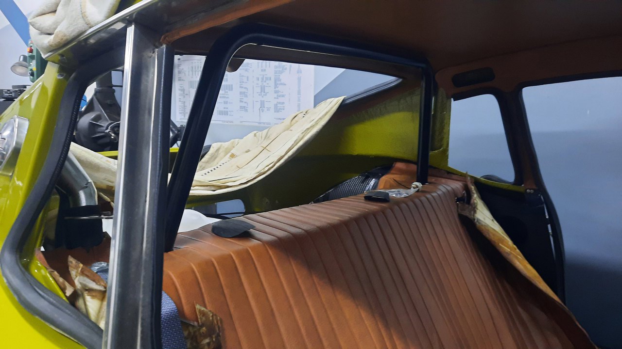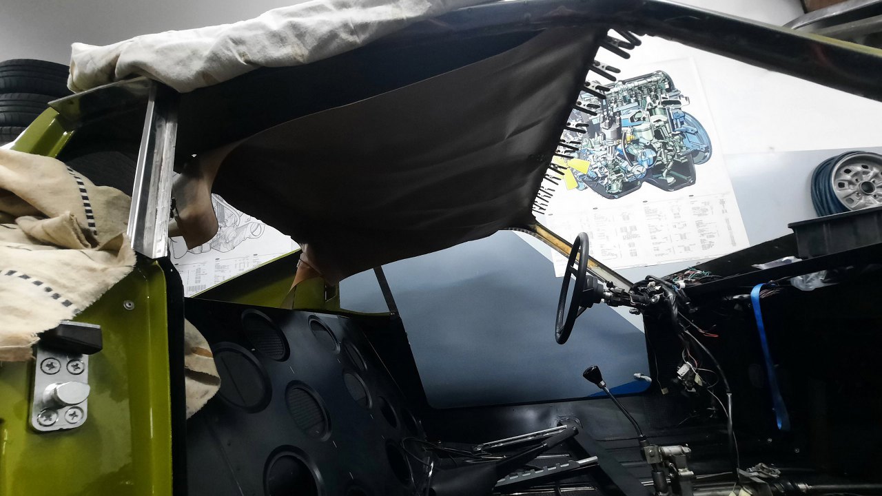 Po założeniu tej tapicerki na ścianę grodziową mogę też założyć pałąk antykapotażowy. Trzyma on też dach w tylnej części, przykręcone są do niego też zawiasy tylnej szyby.