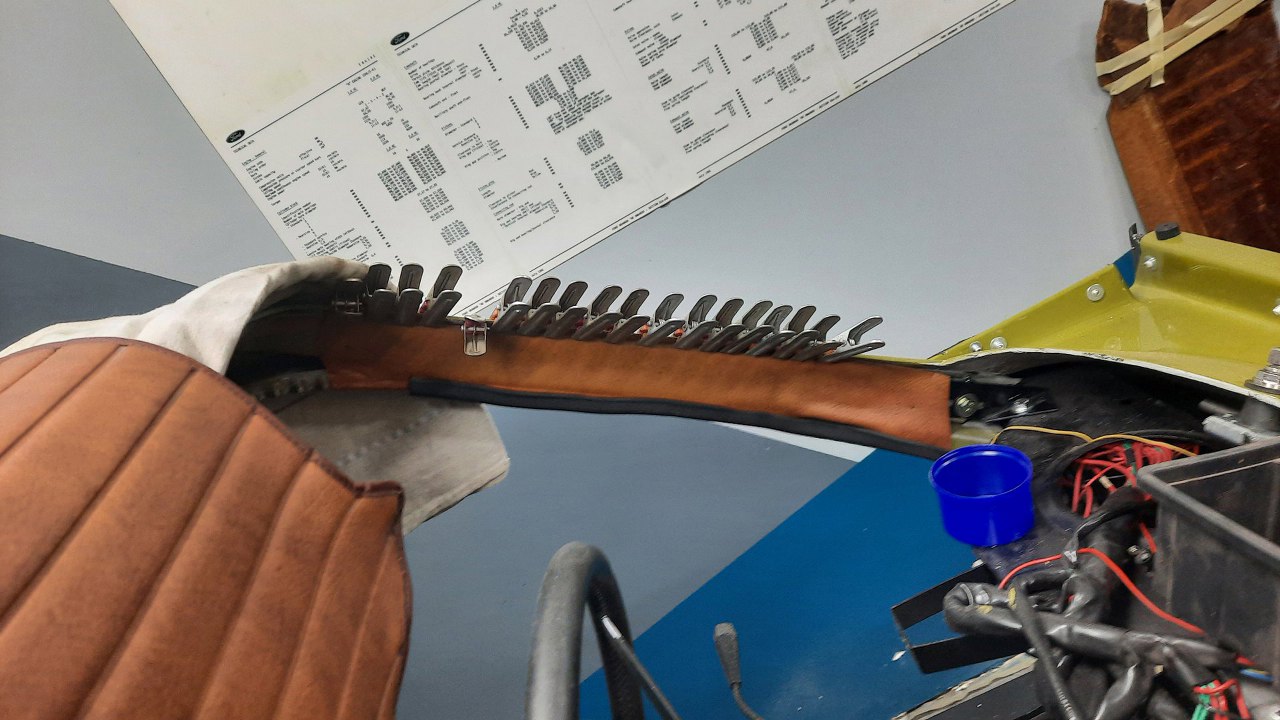 Potem przymierzyłem tapicerkę. Ustaliłem jej pozycję i przyczepiłem przednią krawędź do dachu spinaczami.