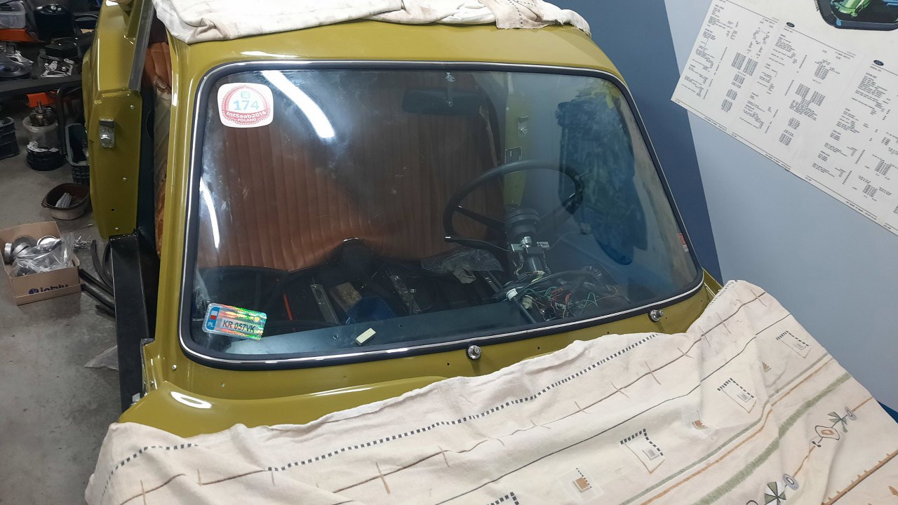 Tu nie mam za dobrych zdjęć z samego procesu, ale uszczelkę założyłem na szybę, obciąłem na wymiar i skleiłem końce ze sobą. Potem nastąpiła żmudna faza wkładania jej na miejsce. Niezła harówa dla dwóch osób. Do tego karoseria nie jest stalowa, a z laminatu, więc nie było to łatwe. Ostatecznie szyba wskoczyła na miejsce i ułożyła się. Przygotowałem więc klin ozdobny.