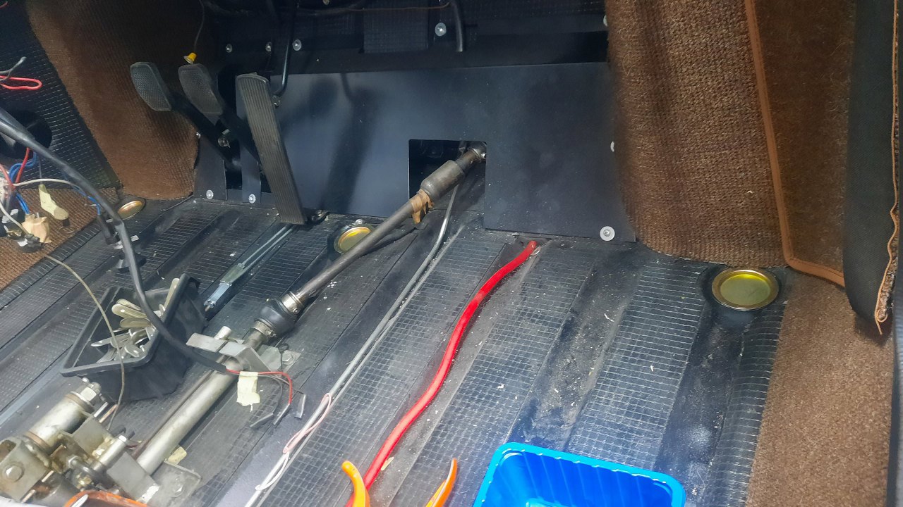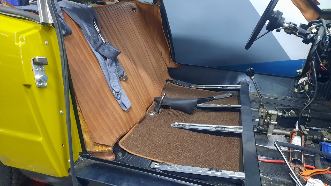 Potem przykręciłem też pasy bezpieczeństwa - od góry, przy pałąku. Położyłem też wykładzinę pod fotelami. Tu już wszystko mam gotowe i mogłem przykryć podłogę. Z przodu jeszcze walczyłem z hamulcami :).