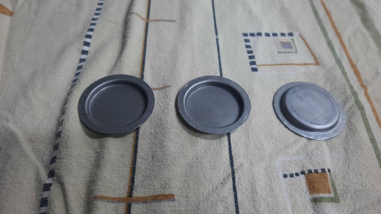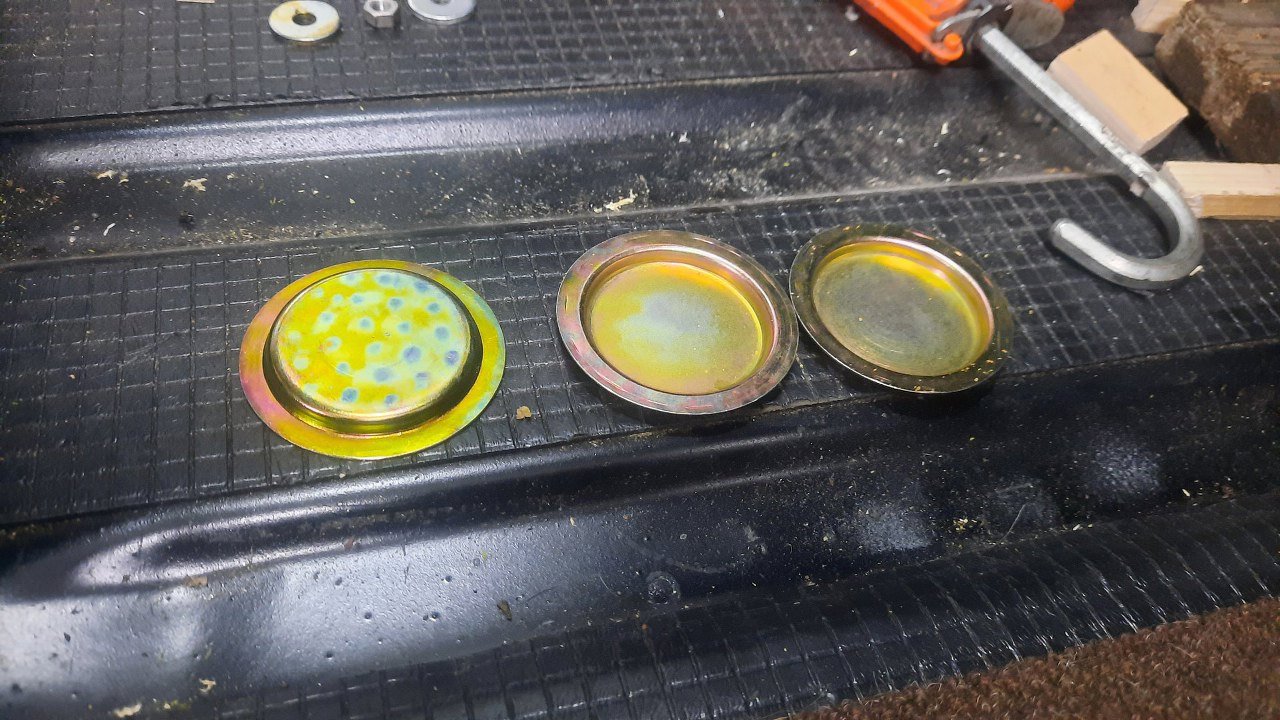 Podczas remontu podwozia miały być dorobione trzy zaślepki w przedniej części podłogi, bo były zgnite. Jakoś to jednak nam umknęło. Dorobione zostały korespondencyjnie - podałem wymiar otworu i kolega blacharz wytłoczył odpowiednie kółka.