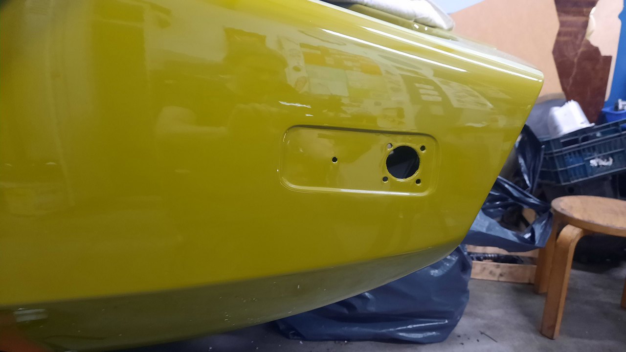 Od środka rozplątałem spaghetti kabelków i podłączyłem (jak się okazało później, nawet poprawnie!) je do konektorków lamp. Po prawej widać otwór na obrysówkę lewą. Tu samochód był kiedyś uderzony i szpachla ma grubość ponad centymetra. To sprawi pewien problem w przykręceniu obrysówki...