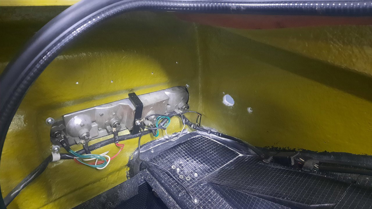 Mosiężne rurki wchodzą od zewnątrz w otwory w karoserii w rogach bagażnika, od dołu na to nakłada się rurki.