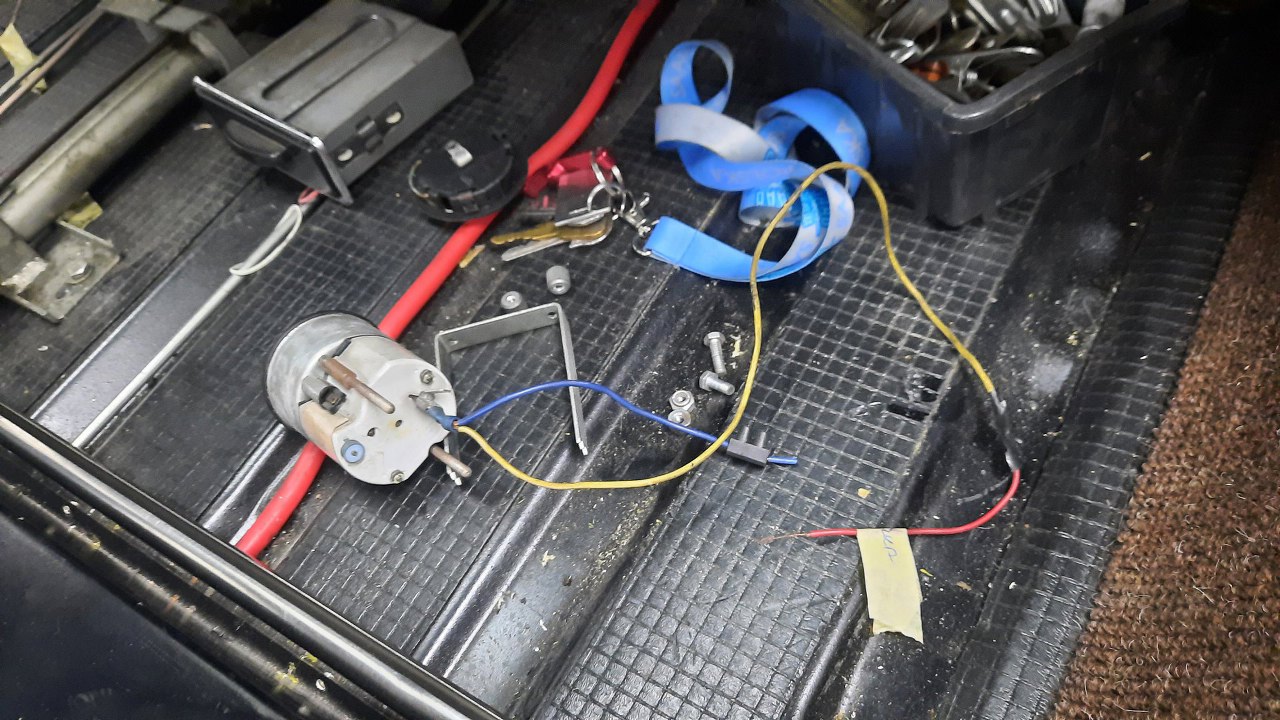 Potem uporządkowaliśmy kabelki idące do włączników w centralnej części deski i podłączyliśmy je. Radio póki co jest wyjęte (to oddzielna historia na później), ale ma zrobione nowe przewody zasilające o właściwych kolorach. Na miejsce trafił też przycisk klaksonu.