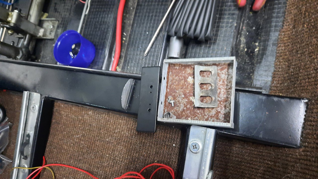 A tą stroną będzie to skierowane w stronę karoserii. W dystansach są nawiercone szersze otwory od tej strony, żeby weszły w nie nitonakrętki. Tu już przynitowałem tablicę rejestracyjną.