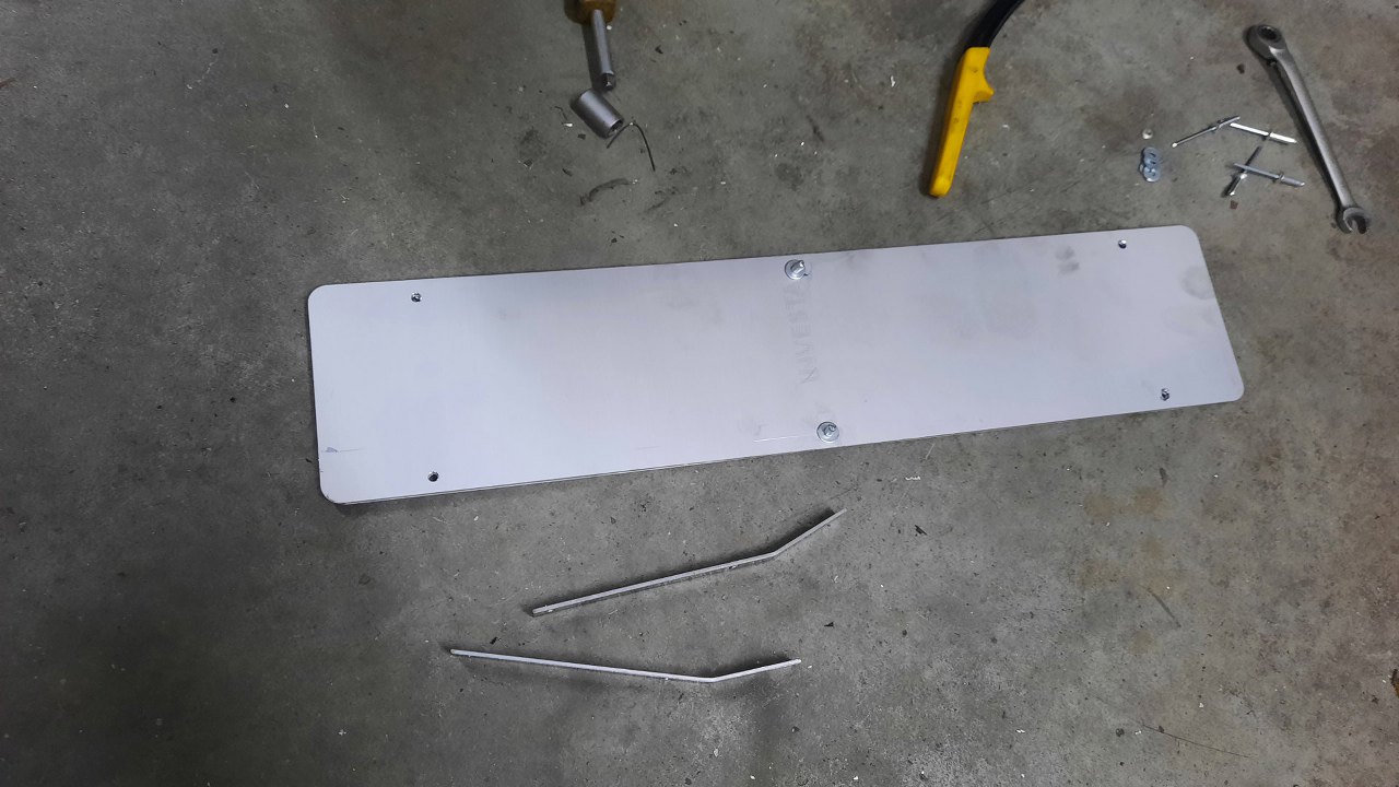 No i tablice rejestracyjne. Jakoś trzeba je było przymocować tylna była przykręcona w plastikowej ramce (A FU!), a przednia zamocowana była poprzez rurę odpływową od zlewu na srytytki do przodu samochodu. W trakcie lakierowania wszysttkie nadplanowe otwory poprosiłem, żeby zostały zaklejone, żeby zacząć od czystego nadwozia. No i jesteśmy tu teraz, z tablicami do przyczepienia... Zaczynam od wyciętych laserem blaszek z nierdzewki o grubości 2mm. Mam tego całą stertę i niespodziewanie szybko to znika, bo kto to zobaczy to chce takie coś mieć. Blacha ma wymiar tablicy i służy do jej usztywnienia. Otwory... w każdym przypadku mam inny pomysł, więc są wiercone już w zależności od okoliczności. Tu mam 6 otworów, na wylot przez blachę i tablicę. Dwa pośrodku od razu zanitowałem. Zewnętrzne będą jeszcze mocowały te dwa płaskowniki widoczne poniżej.