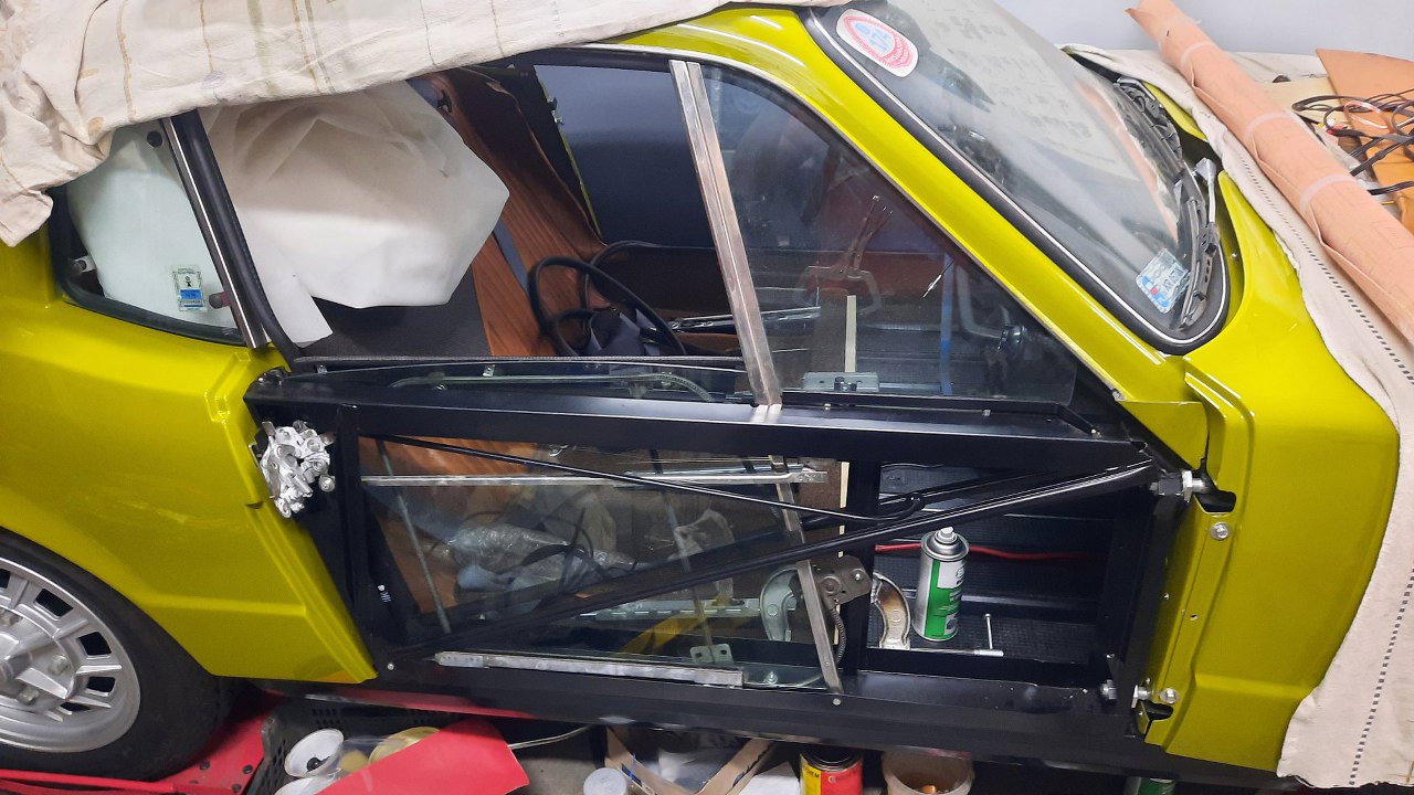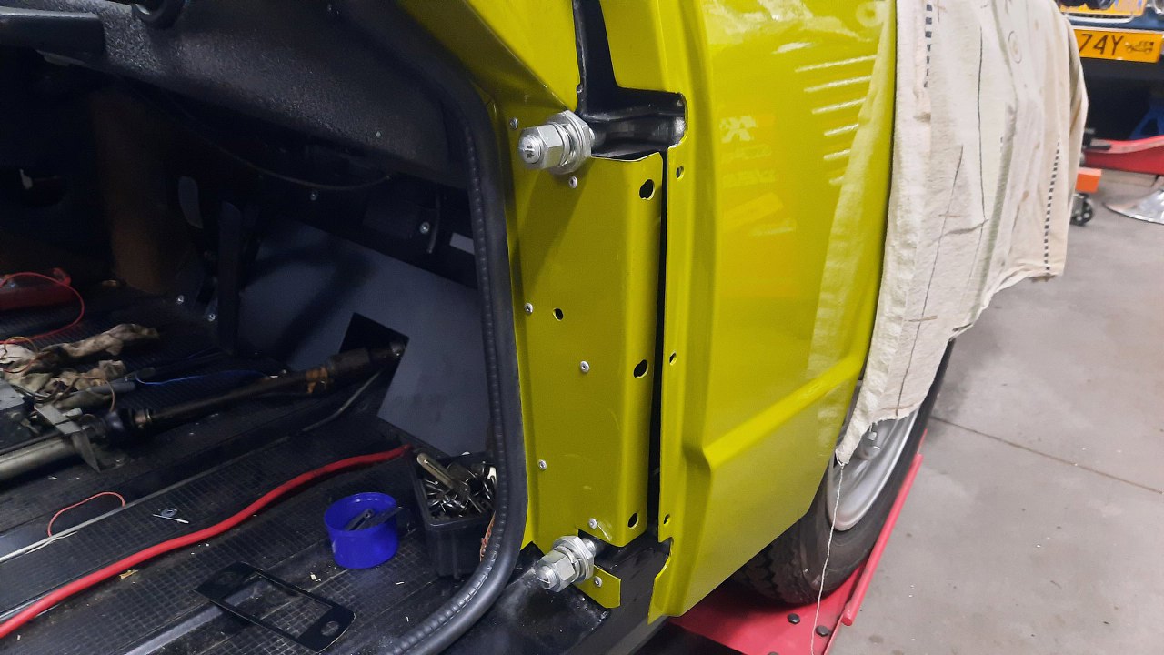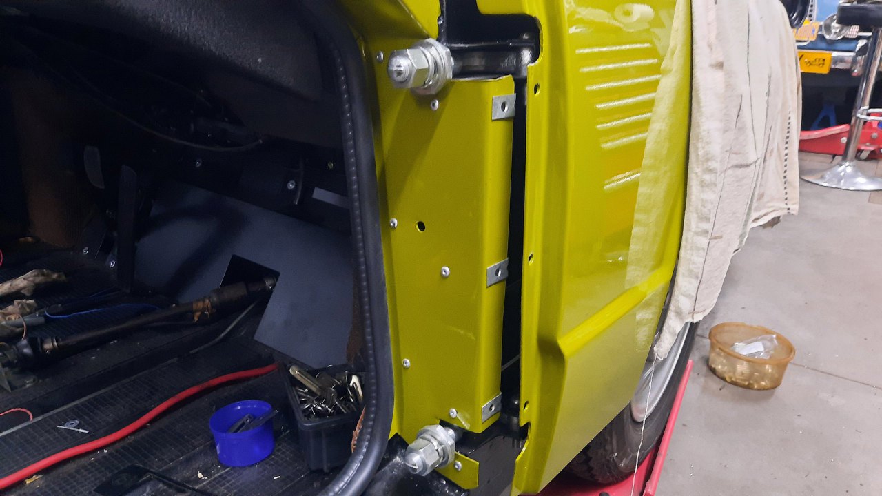 Po przykręceniu zawiasów wstępnie to wszystko wyregulowałem, żeby drzwi o nic nie zawadzały. Wyregulowałem też zatrzask zamka na słupku B, żeby drzwi normalnie się zamykały. Dokładną regulację wykonam dopiero po założeniu poszyć.