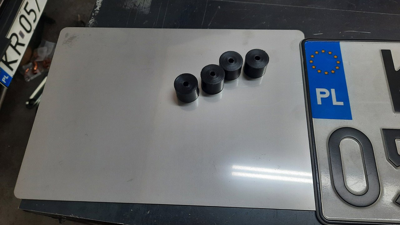 Wróćmy do tablic rejestracyjnych. Do tej pory nie miałem nic z kwadratową tablicą, więc musiałem chwilę poczekać na wycięcie laserm nowych blach pasujących pod tą tablicę. Potem wytoczyłem z plastiku cztery dystanse o skrupulatnie wyliczonych wymiarach.