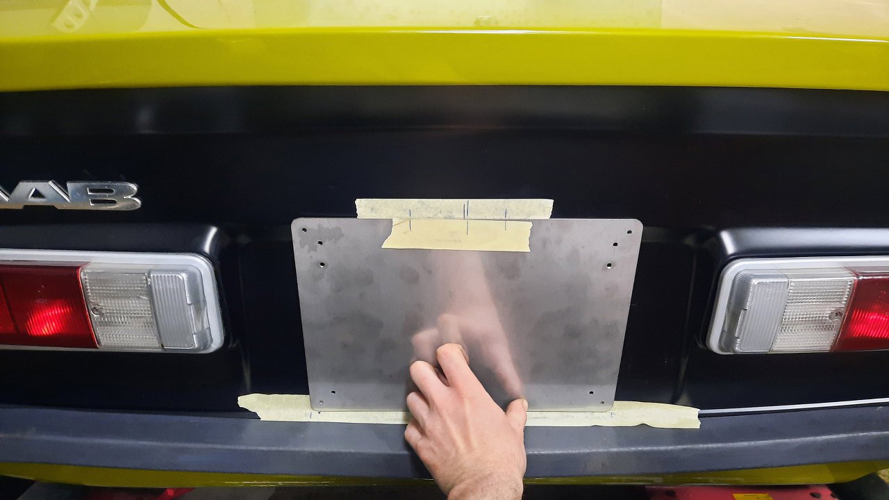 Przykleiłem taśmą tablicę rejestracyjną (z drugiej strony) i wywierciłem cztery otworki, przez które przynituję tablicę do blachy.