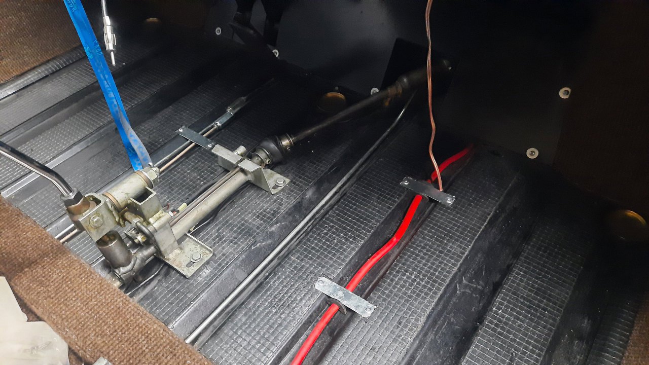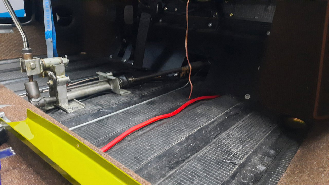 Najpierw trzeba przyczepić blaszki usztywniające przewód akumulatora, czy rurki hamulcowe. W innych, niż oryginalne miejscach, ale za to tam, gdzie potrzebne. Przykręciłem też już dźwignię zmiany biegów do podłogi, po jej wyregulowaniu.