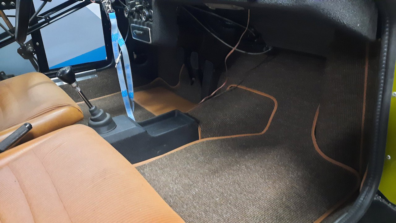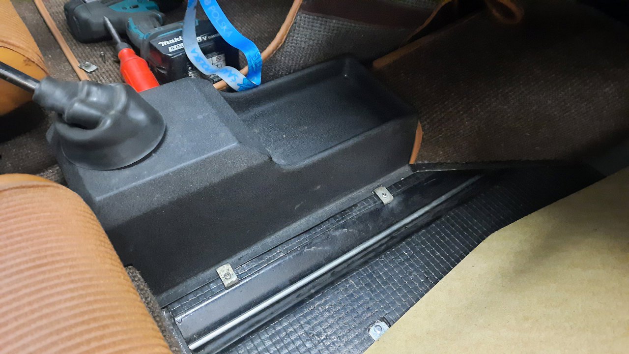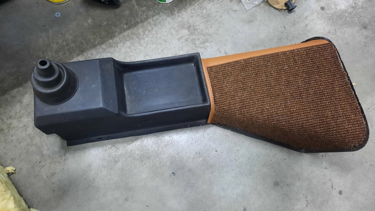 Bo do włożenia została jeszcze osłona mechanizmu zmiany biegów. Ten kawałek wykładziny też jet nowy. Klejenie sztywnej wykładziny w tak wygięty kształt było niełatwe :).