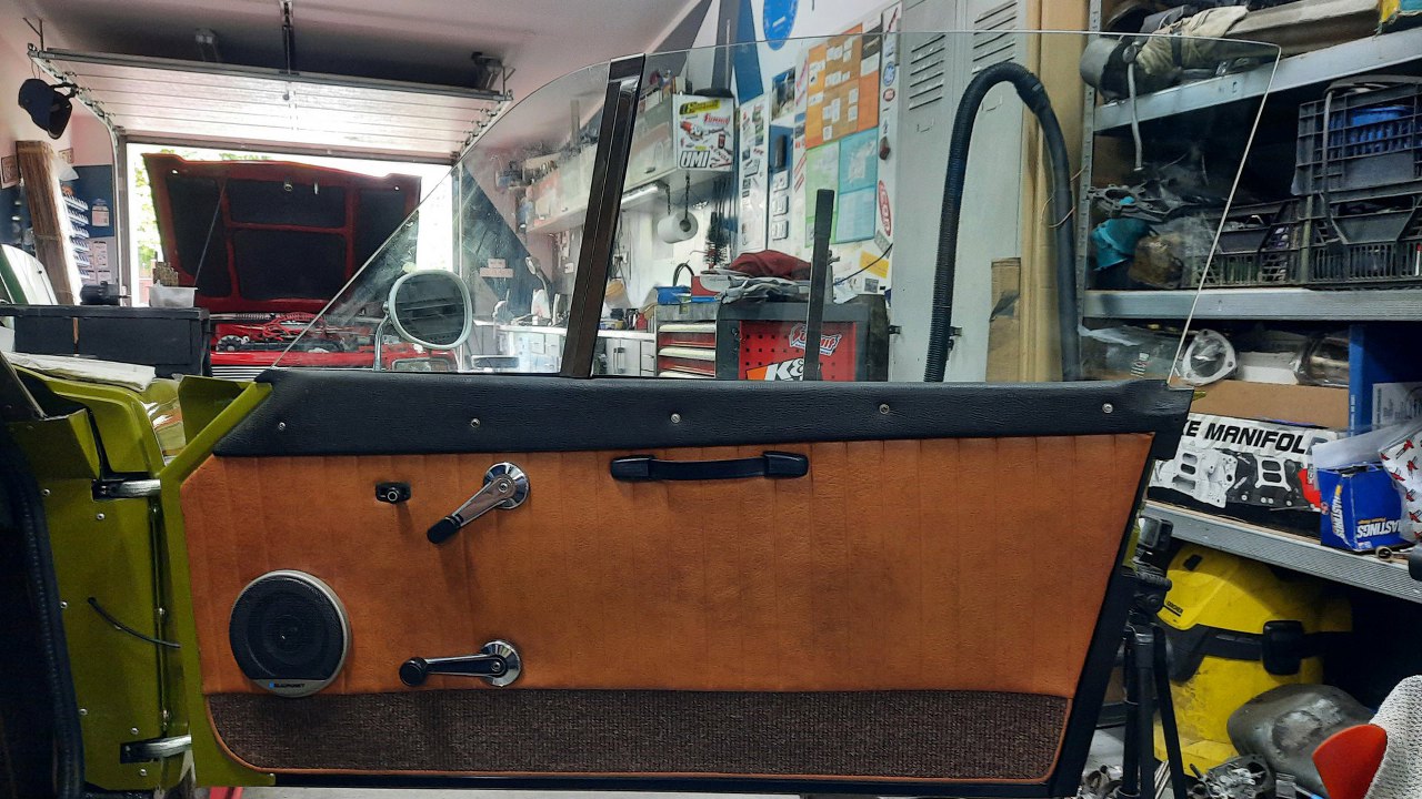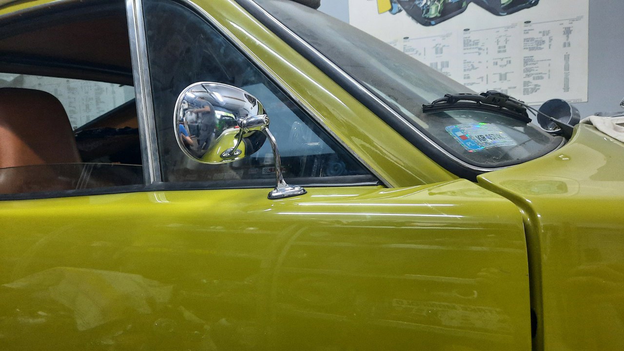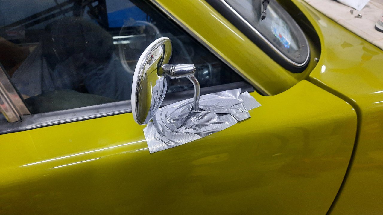 Potem z Wojtkiem (właścicielem) założylimy drzwi i je z grubsza wyregulowaliśmy. Te "z grubsza" i tak zajęło sporo czasu... Potem zajęliśmy się lusterkami. Te, co były, bullety, nie będą użyte, Wojtek kupił takie reprodukcje, zbliżone bardzo do oryginalnych. Przymocowałem je tymczasowo do poszyć i Wojtek usiadł na miejscu kierowcy, sprawdzić czy coś w nich widzi.
