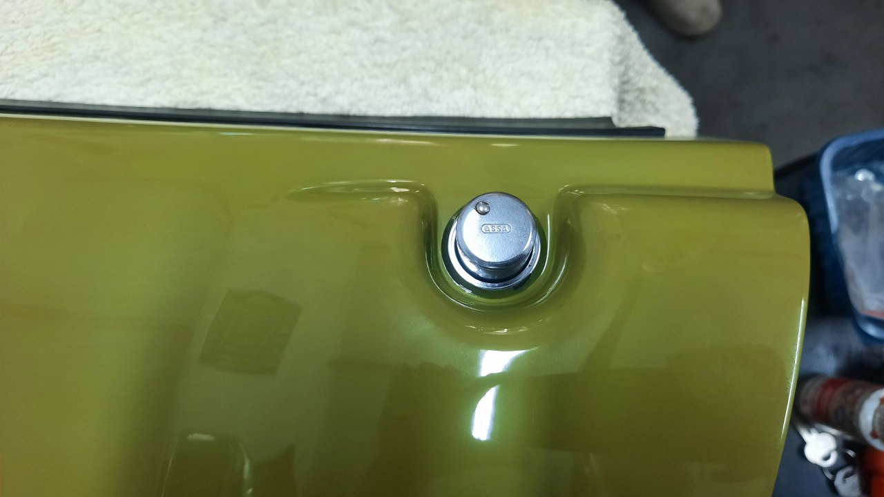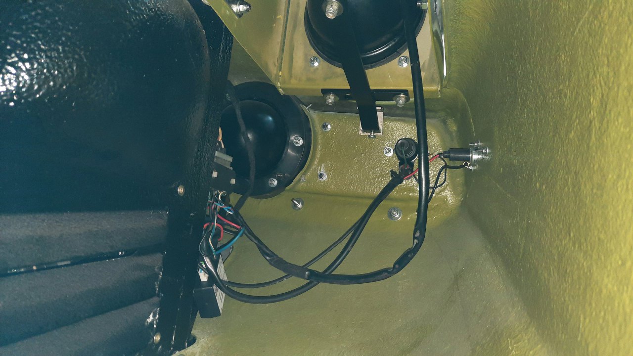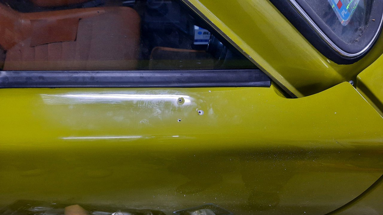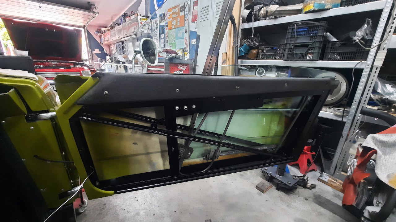 Potem z Wojtkiem (właścicielem) założylimy drzwi i je z grubsza wyregulowaliśmy. Te "z grubsza" i tak zajęło sporo czasu... Potem zajęliśmy się lusterkami. Te, co były, bullety, nie będą użyte, Wojtek kupił takie reprodukcje, zbliżone bardzo do oryginalnych. Przymocowałem je tymczasowo do poszyć i Wojtek usiadł na miejscu kierowcy, sprawdzić czy coś w nich widzi.