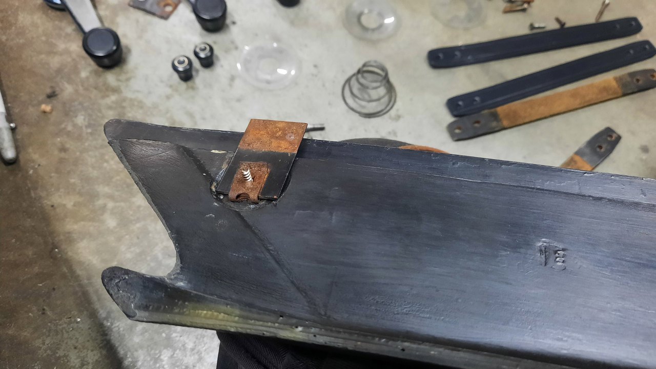 U dołu drzwi poszycie było mocowane na takie wygięte blaszki. Stare były skorodowane, więc miałem dorobione nowe. Musiałem je tylko odpowiednio wygiąć. Najbardziej mnie zdziwiło to, że w dorobionych blaszkach pasują otwory do poszyć i szkieletu drzwi :). Tego na razie jednak nie nituję, bo nowe blaszki muszę oddać do cynkowania.